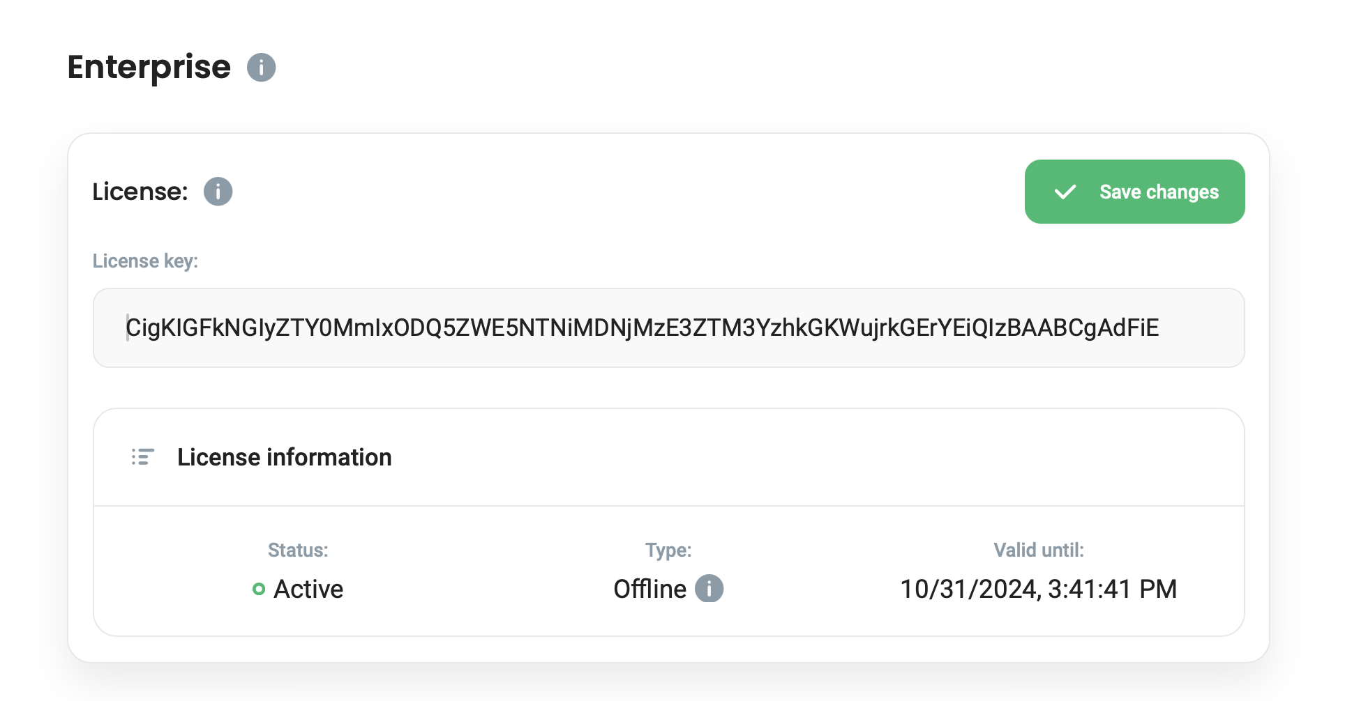 To configure Defguard with the received license, please go to **Settings** -> enter the license in the Enterprise License configuration window -> Click Save.