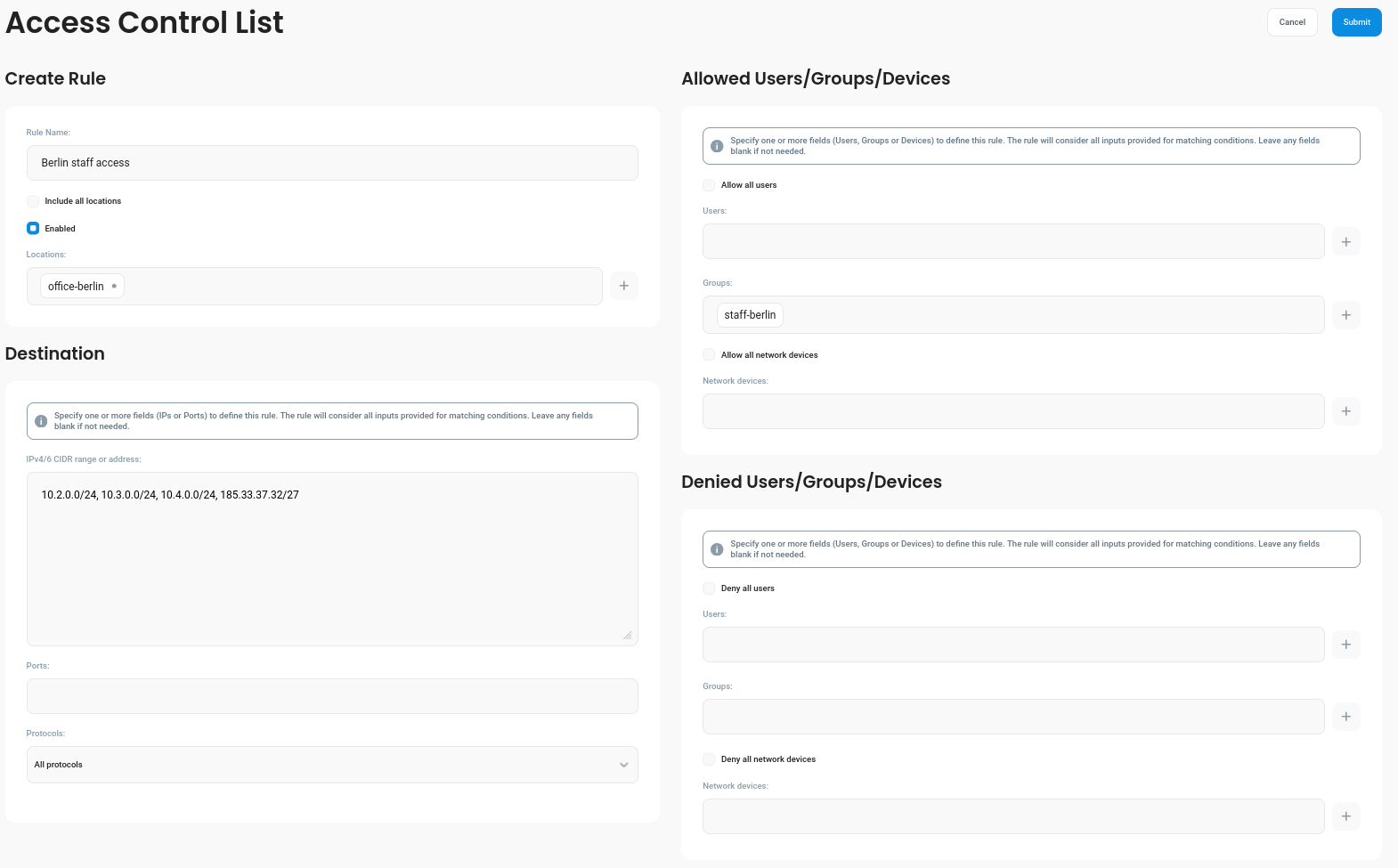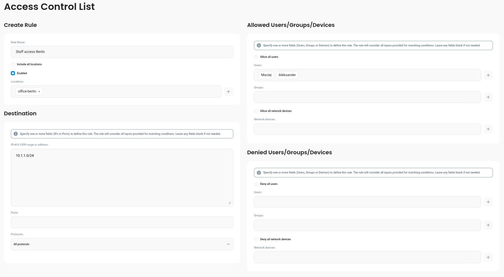 10.1.1.0/24Instead of specific users in the Allowed Users input, we now select the Staff-Berlin group in the Allowed Groups input