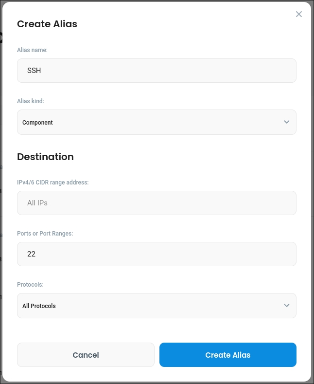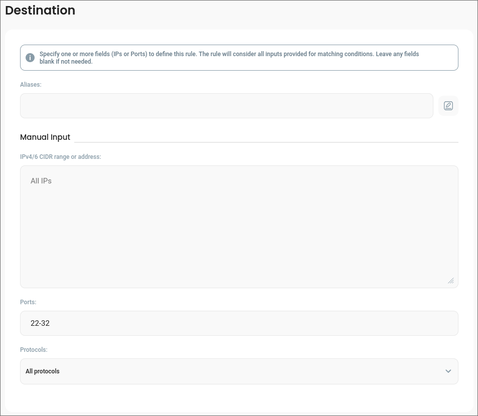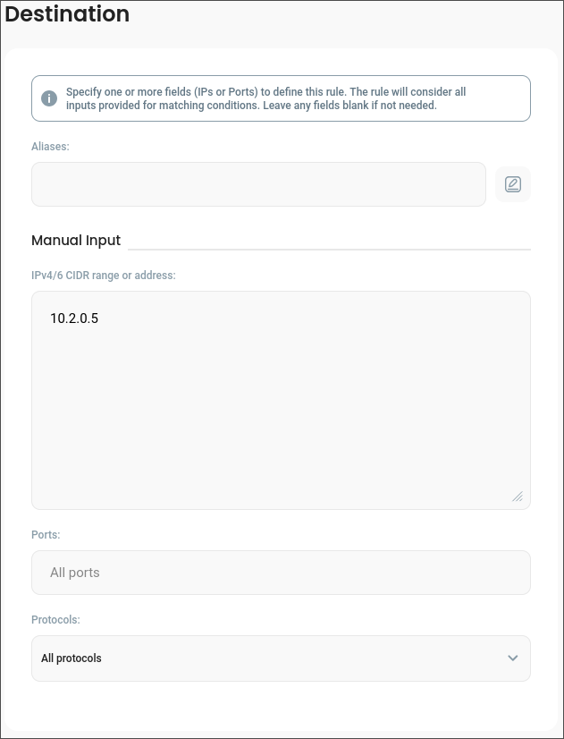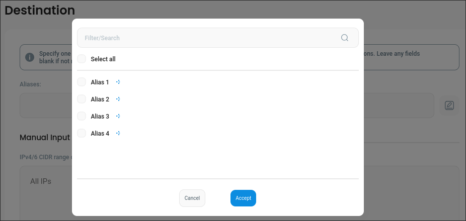Aliases can be used to define an ACL rule destination by selecting them in the input within the Destination section: