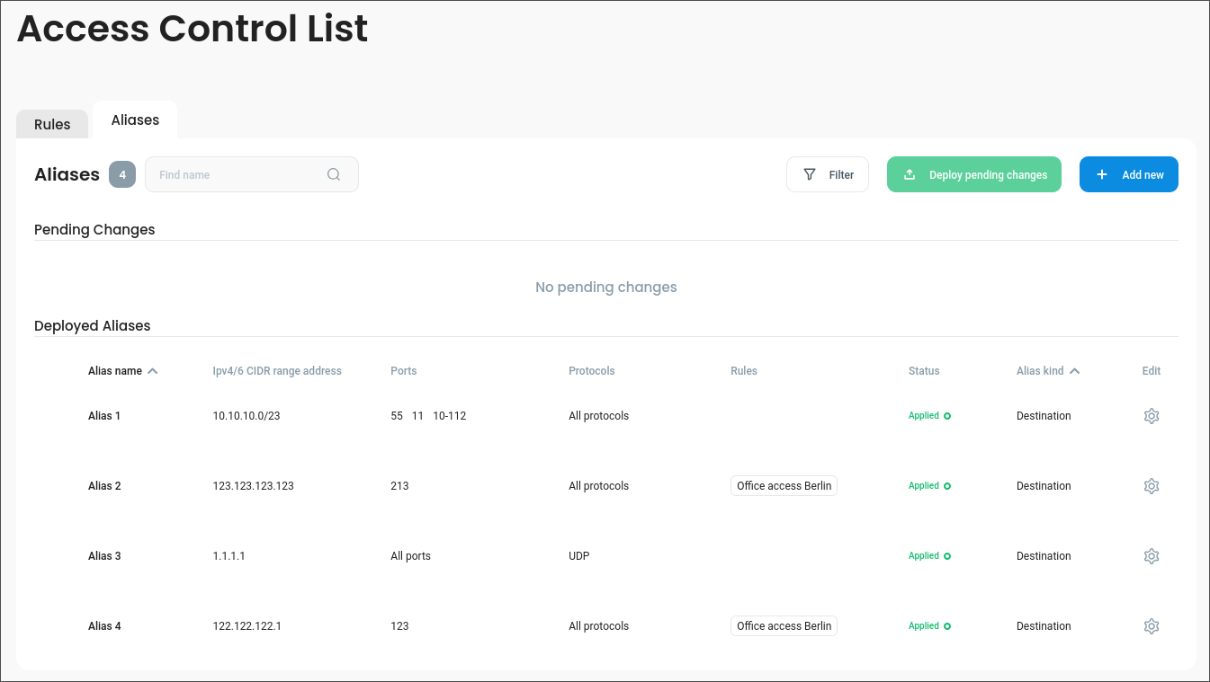 Deployed Aliases – aliases that are active and can be used by ACL rules.