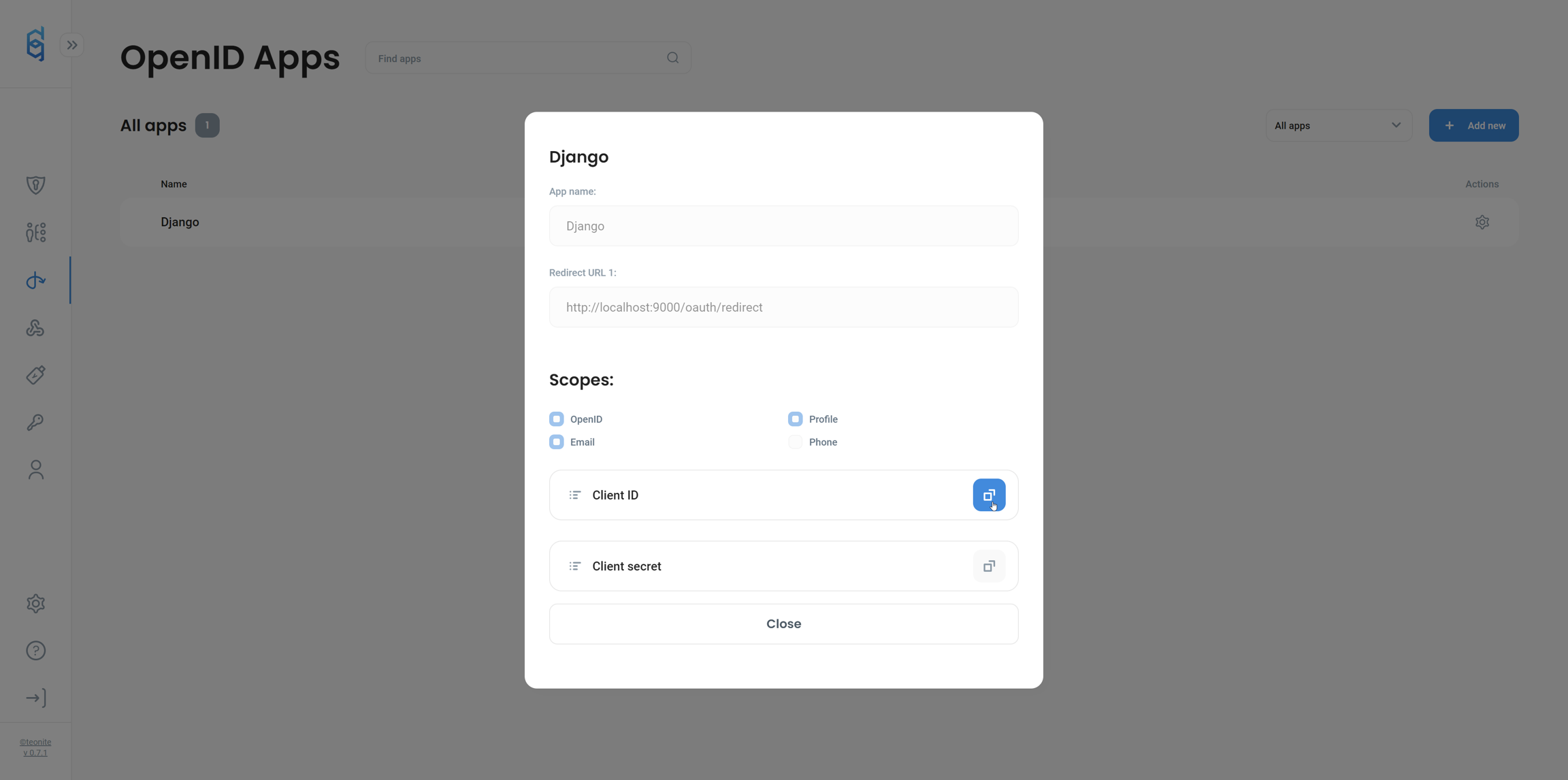 Both Client ID and Secret can be found on OpenID apps page in Defguard, click our Django app row on the list and you will be able to copy needed values from the opened modal.