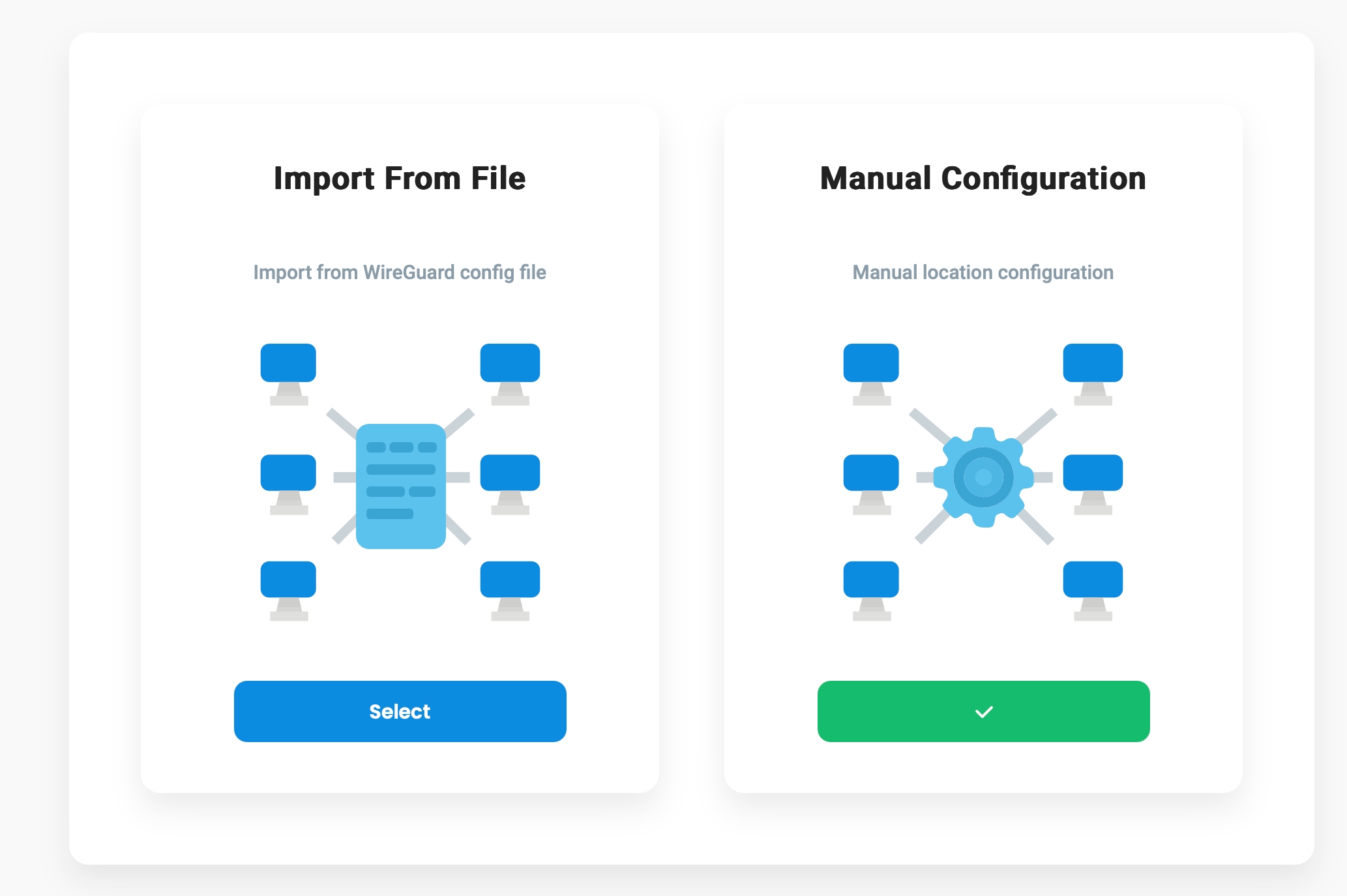 When creating a new VPN location, you can choose if you want to create it from scratch (Manual Configuration) or import your current WireGuard configuration: