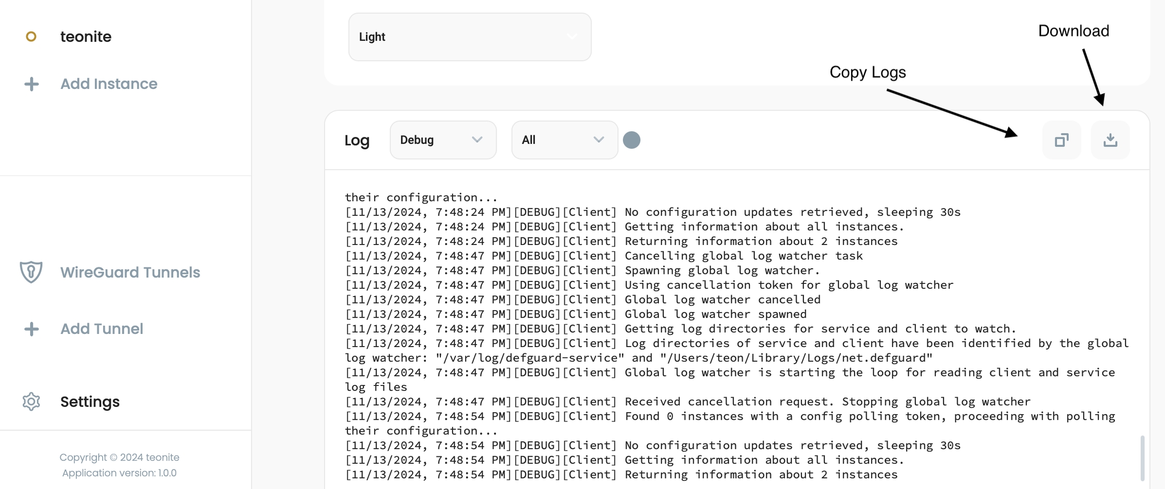You can easly send us client logs by going Settings -> in the Log window you will have the possibility to see the logs, but also two buttons, to Copy the logs or Download them - so you can easly share them with us:
