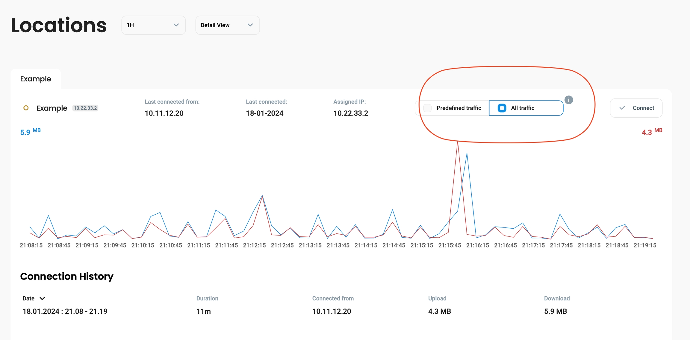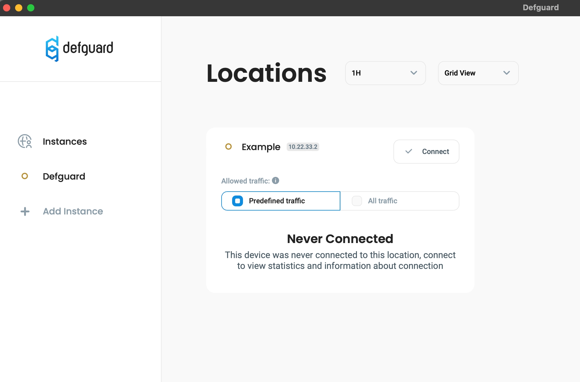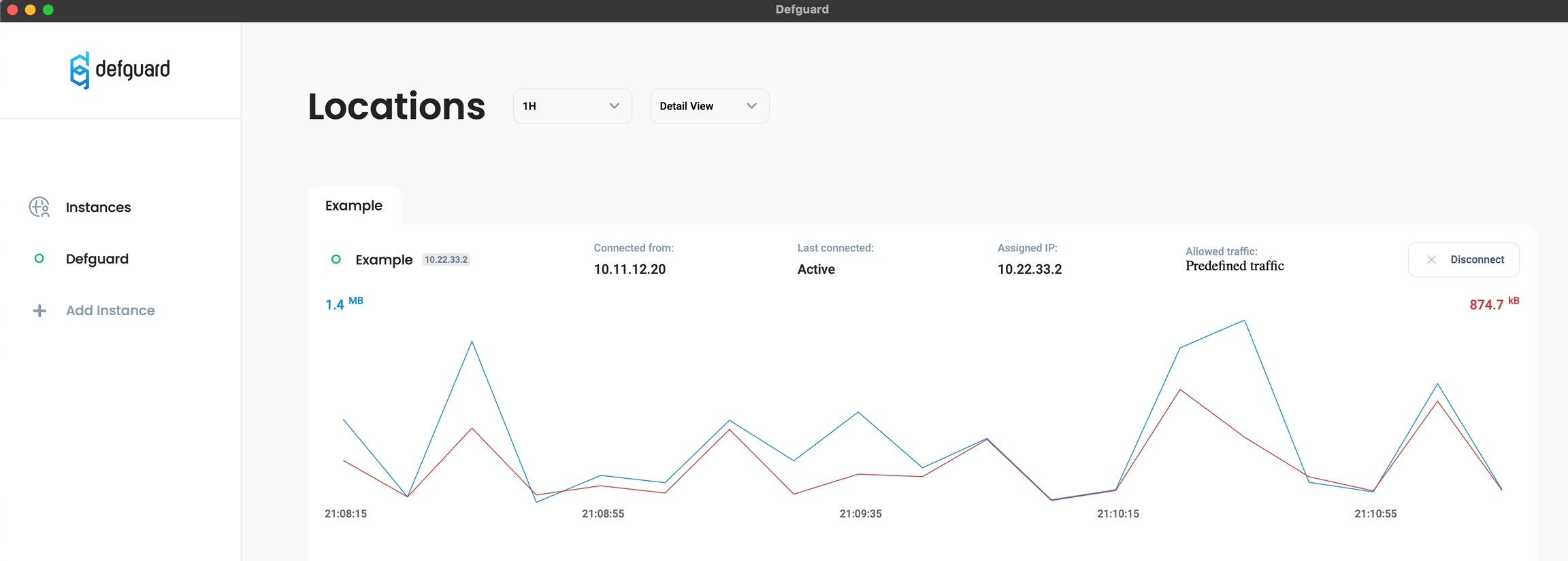 The client will instantly show your Defguard instance and the VPN (we named Example):