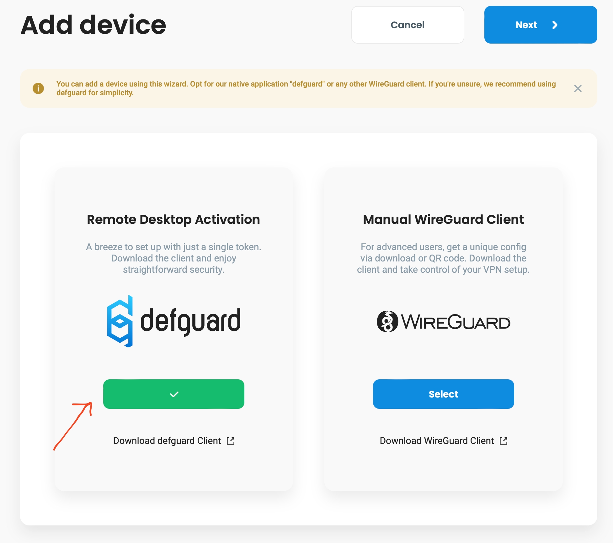 Then choose Defguard Client Remote Desktop Activation - which will easily configure your Desktop client: