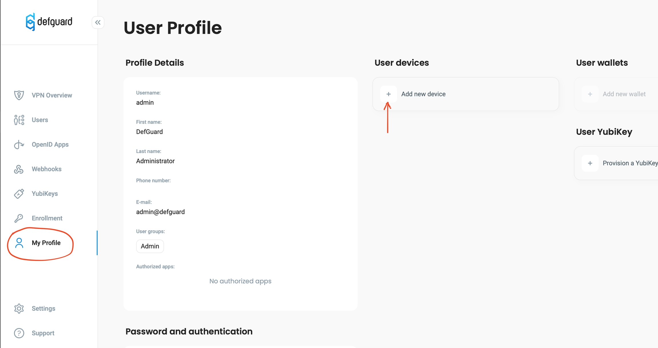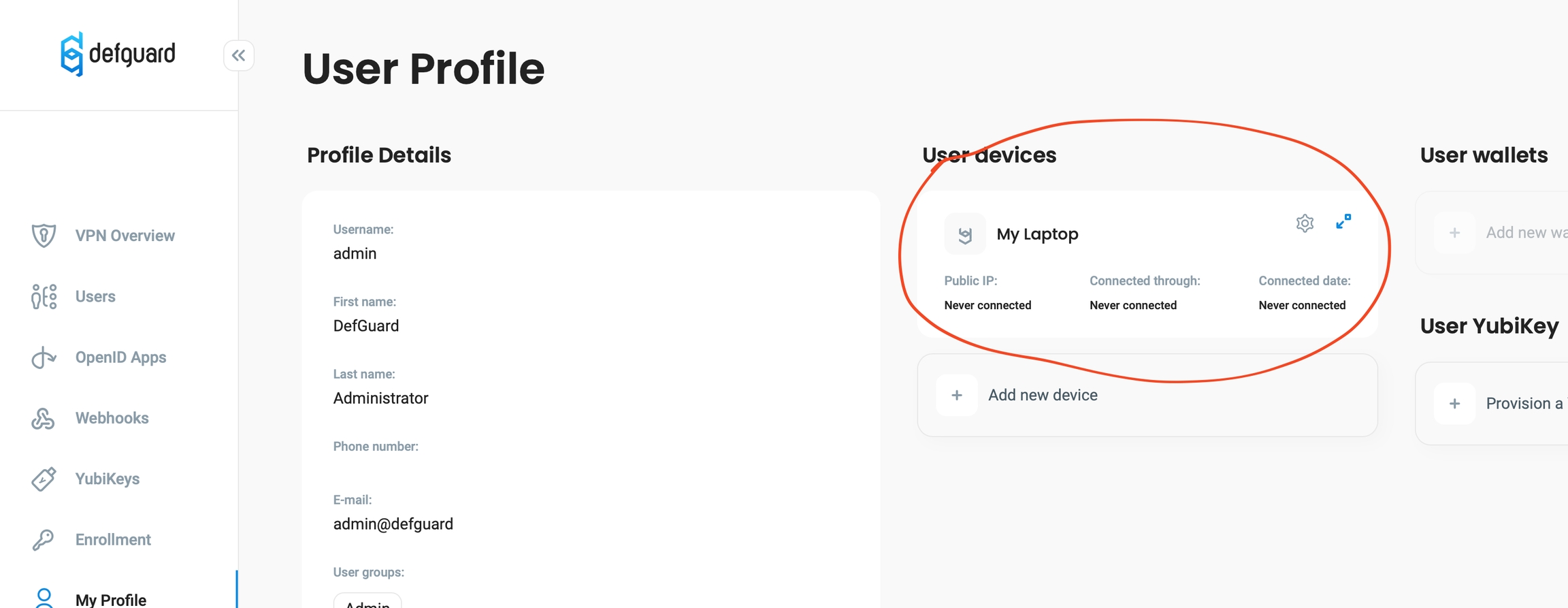 Now, go to Defguard Web UI (in this example: https://my-server.defguard.net) and go to My Profile and click on Add Device: