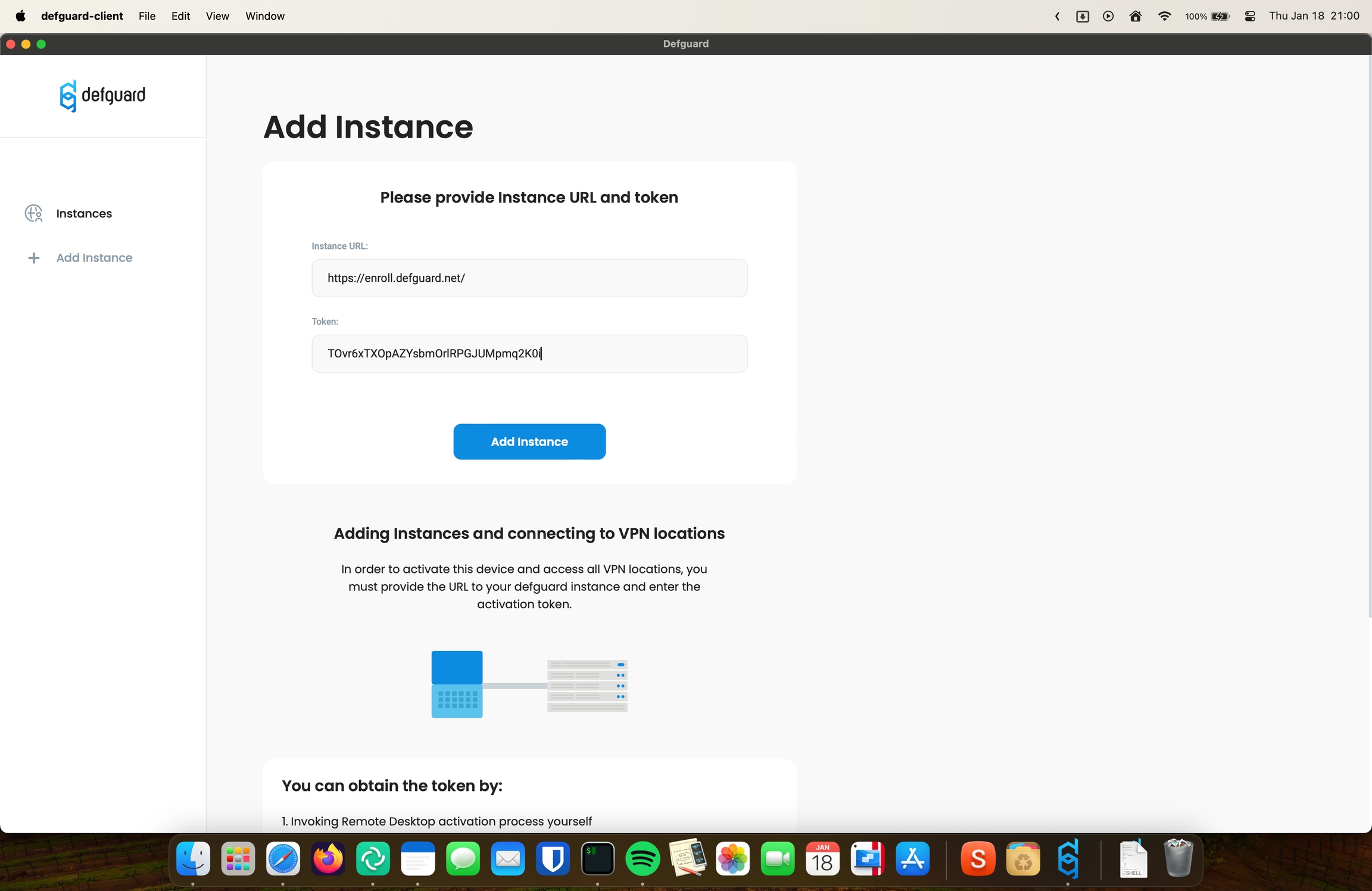 Defguard will show what URL (which is - as you see - your enrollment service URL) and token to paste to your desktop client: