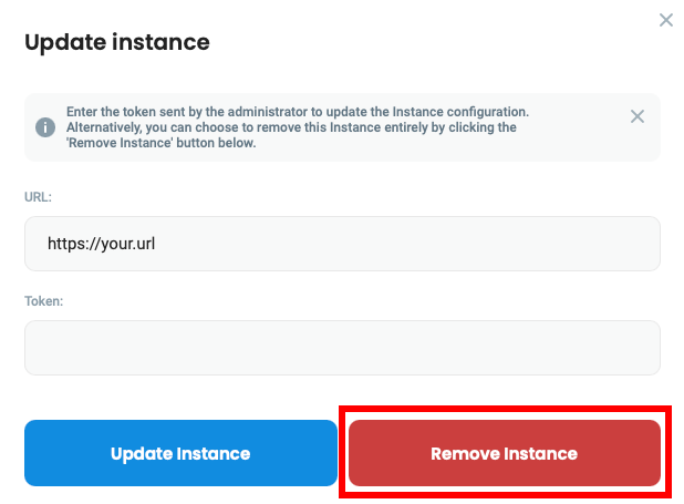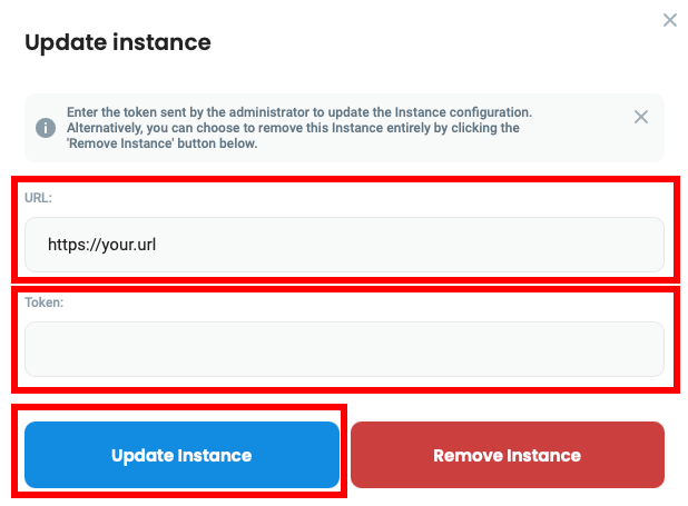 2. Enter Token provided by your administrator, or generate it [on your own](#obtaining-url-and-token). Then click **Update Instance**