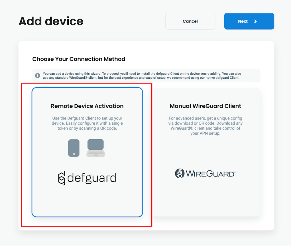 <figure><img src="https://content.gitbook.com/content/qA26Hk2bOkuJXJg4scJ4/blobs/ESlzEzRcZqn7YvfB8wXf/defguard-add-new-device.png" alt="" width="50%"><figcaption></figcaption></figure>