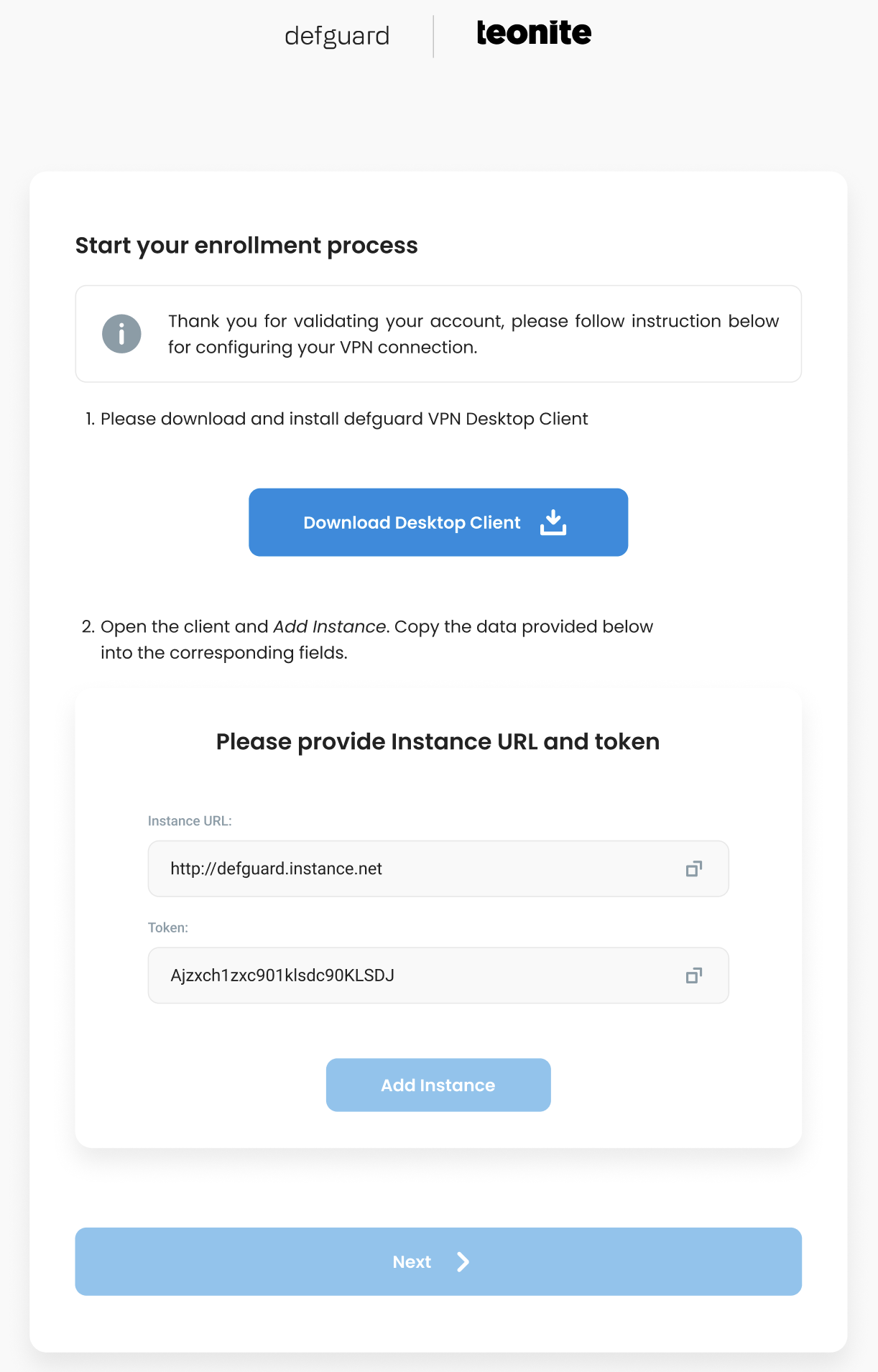 Download the [Defguard desktop client](https://defguard.net/download/), and [enter *Instance URL* and *token* shown on this screen - more details here](https://docs.defguard.net/1.4/using-defguard-for-end-users/enrollment/broken-reference).