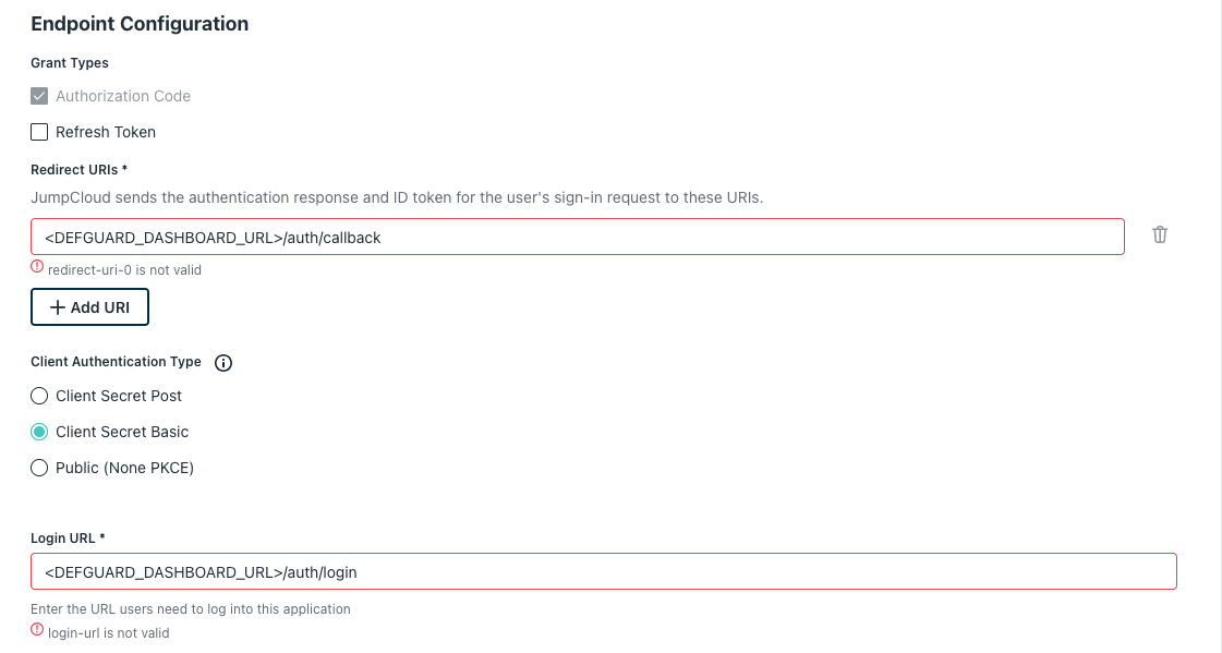 Make sure to set the correct Redirect URI and Login URL that will reflect your Defguard's setup. If you access your Defguard dashboard at e.g. `https://defguard.example.net` your redirect URI will be `https://defguard.example.net/auth/callback` and the login URL `https://defguard.example.net/auth/login`. Additionally, if you are using a Defguard proxy to enroll users, you can also add another redirect URI in the form of `<DEFGUARD_ENROLLMENT_URL>/openid/callback` and `<DEFGUARD_ENROLLMENT_URL>/openid/mfa/callback` if you wish to use the [External MFA feature](https://docs.defguard.net/1.5/wireguard/multi-factor-authentication-mfa-2fa#external-mfa) ( `<DEFGUARD_ENROLLMENT_URL>` is the address at which your Proxy enrollment page is accessible).