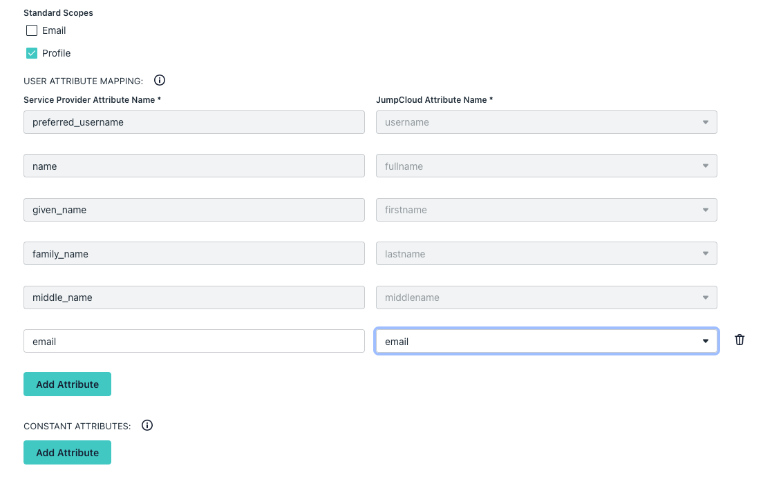 It's important **not** to select the email standard scope checkbox, as it will automatically add a constant `email_verified` field which doesn't conform to the OpenID standard and doesn't work with Defguard. You can see the following section for more information: [#jumpcloud](https://docs.defguard.net/1.5/features/external-openid-providers/..#jumpcloud "mention").
