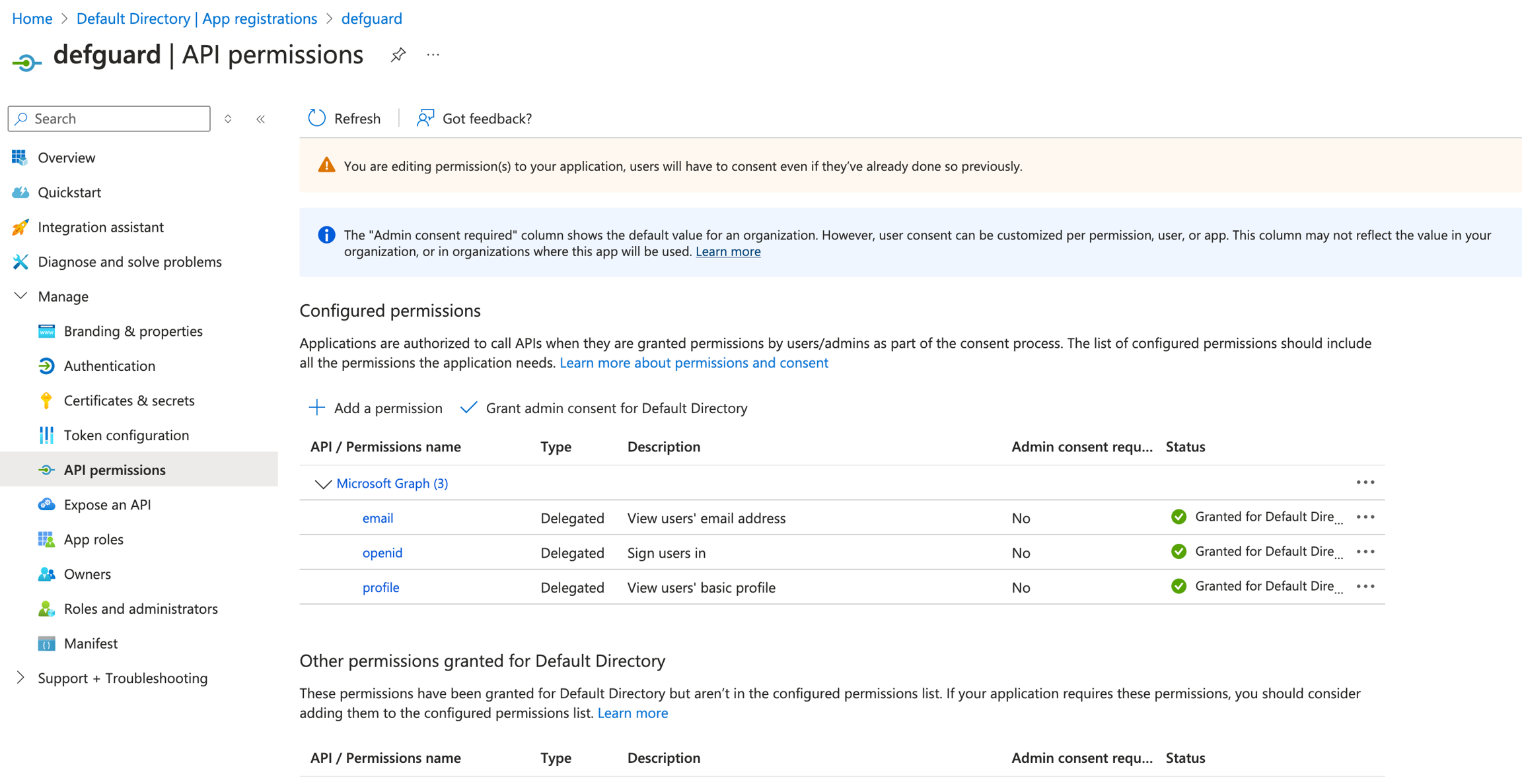 Now grant admin consent for the permissions using the "Grant admin consent for" button