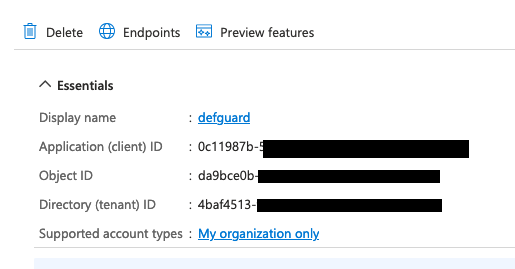 You should be now on the registered application's management screen. You can copy the client's ID and the tenant ID from here, as you need to provide them on the Defguard settings' page.