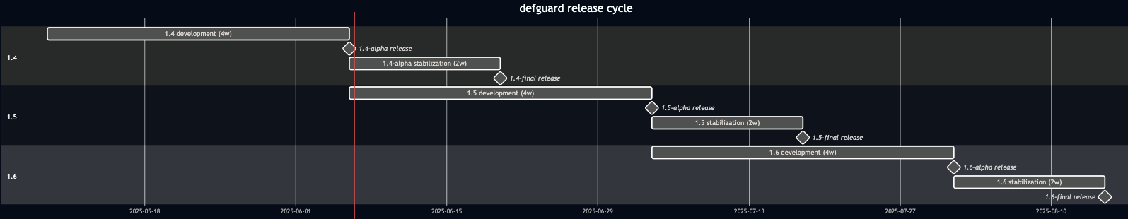 After 4 weeks an alpha release is created (for example 1.4-alpha).