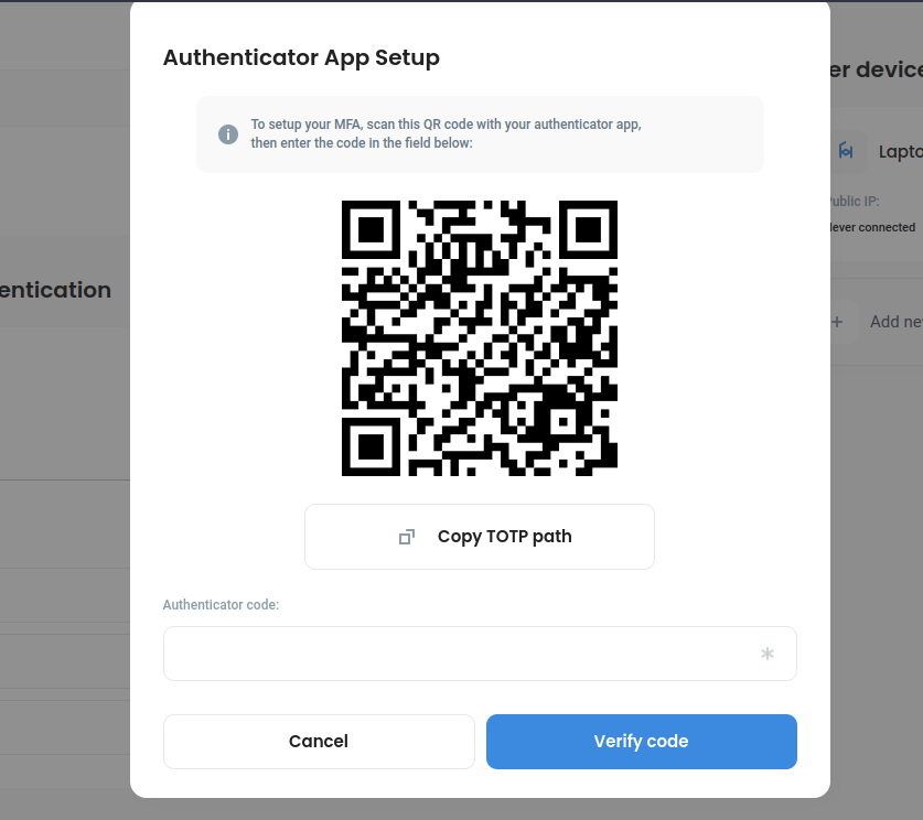 Enter the code you see on the mobile app, to confirm, that the process has been done correctly (Defguard will now validate the code).