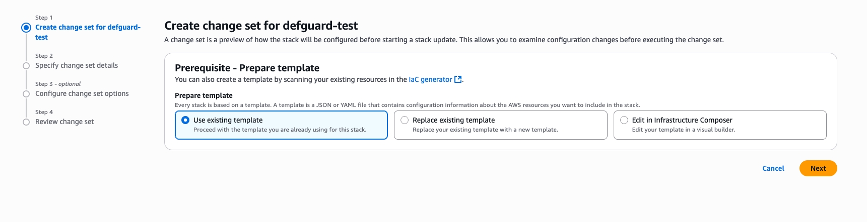 Next, select how you want to update the stack. If you want to modify the parameters, select "Use existing template".