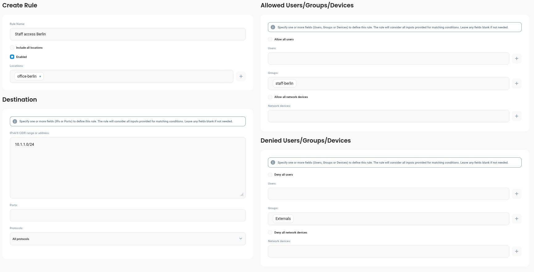 10.1.1.0/24Instead of specific users in the Allowed Users input, we now select the Staff-Berlin group in the Allowed Groups input