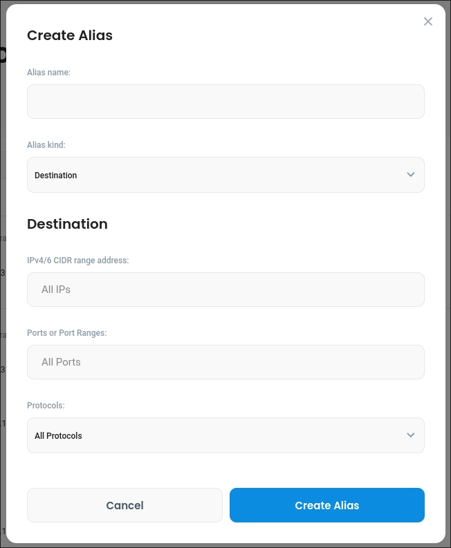 Aliases can be used to define an ACL rule destination by selecting them in the input within the Destination section: