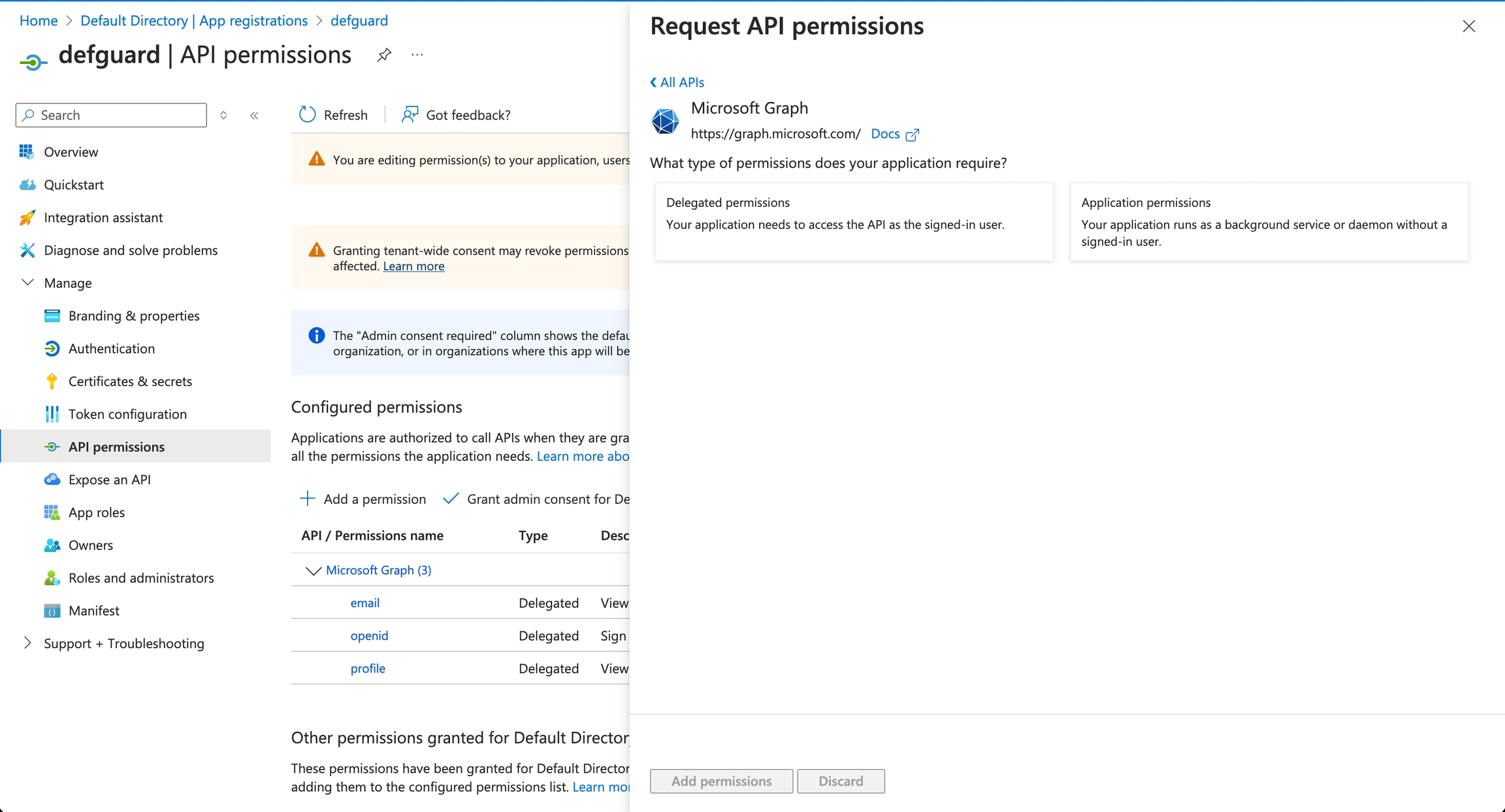 Select "Application permissions", as Defguard will perform the synchronization in the background.
