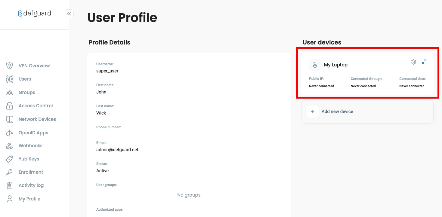Now, go to Defguard Web UI (in this example: https://my-server.defguard.net) and go to My Profile and click on Add Device: