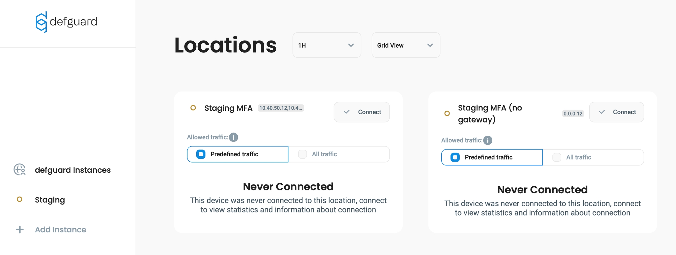 The client will instantly show your Defguard instance and the VPN (we named Example):
