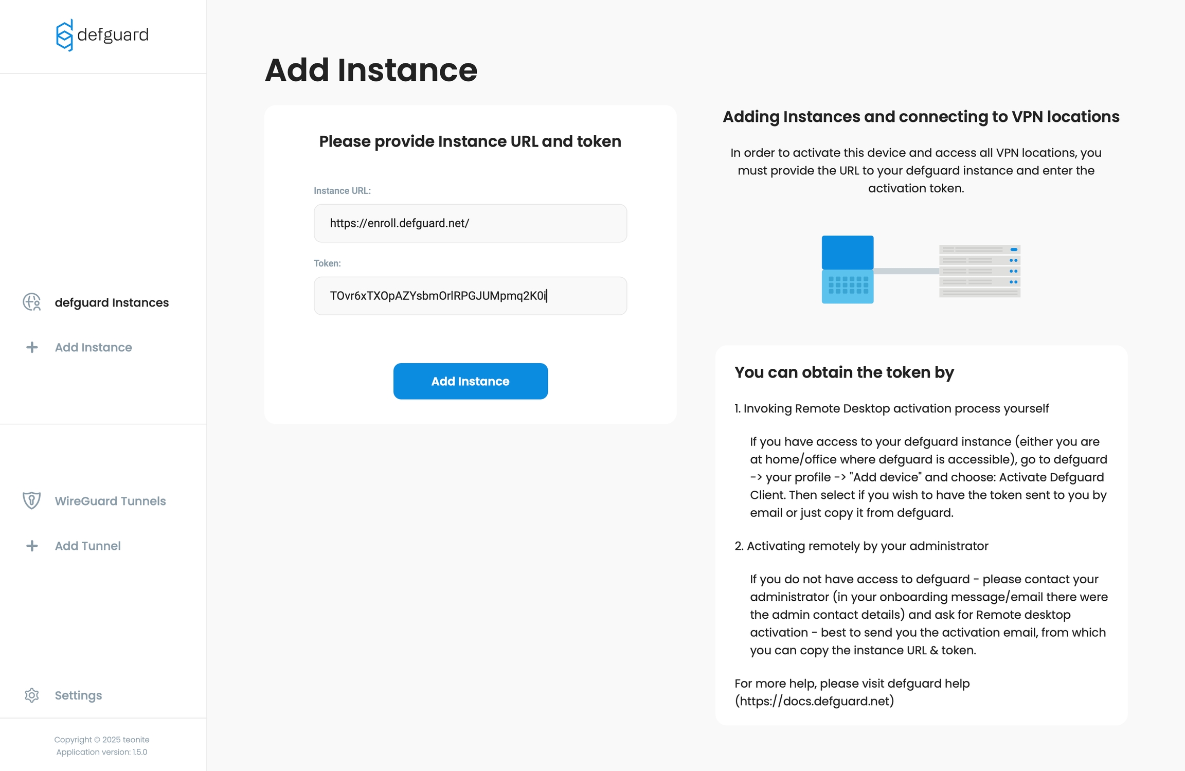 Defguard will show what URL (which is - as you see - your enrollment service URL) and token to paste to your desktop client:
