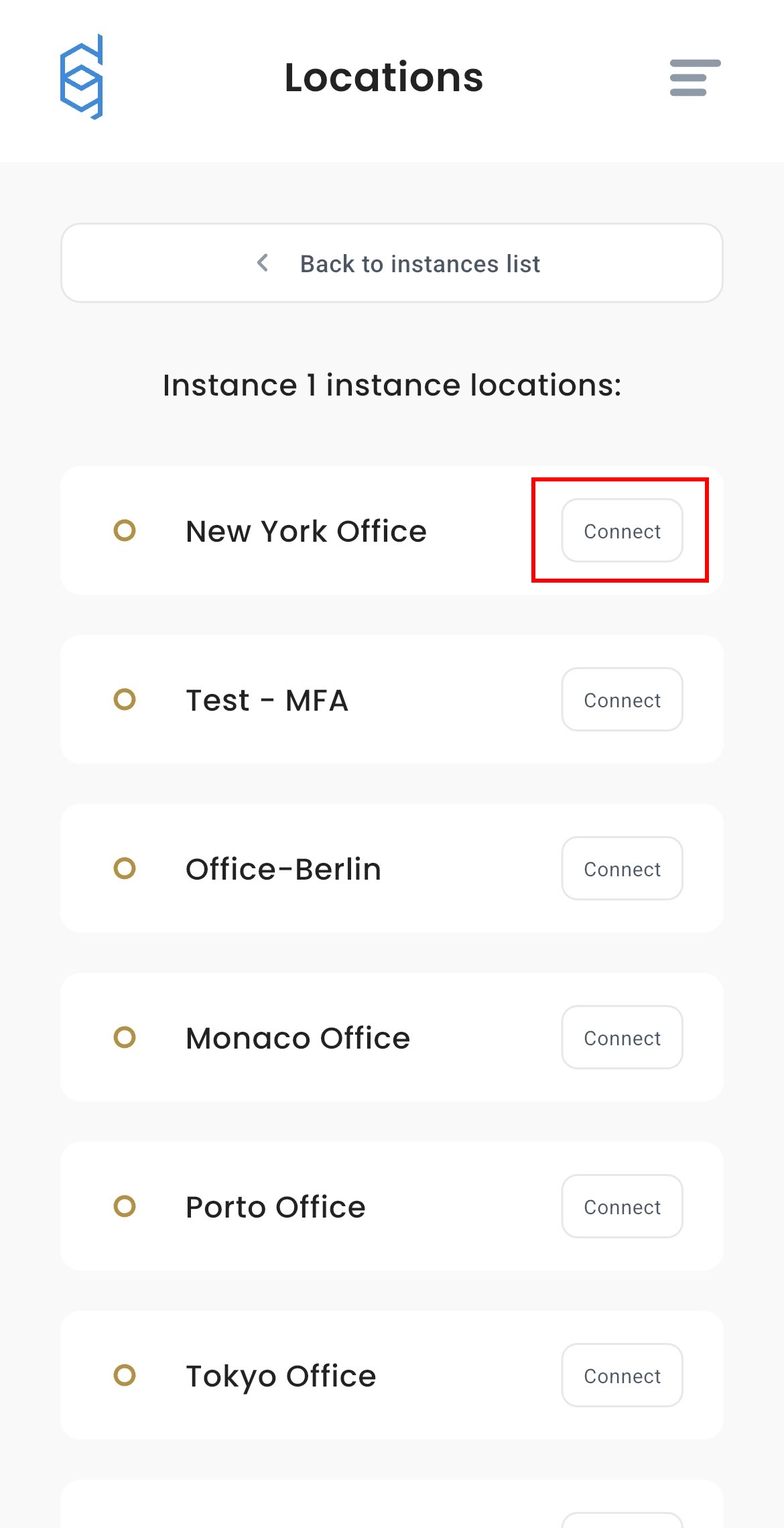 Go to Instances and click Connect next to location you want to use.