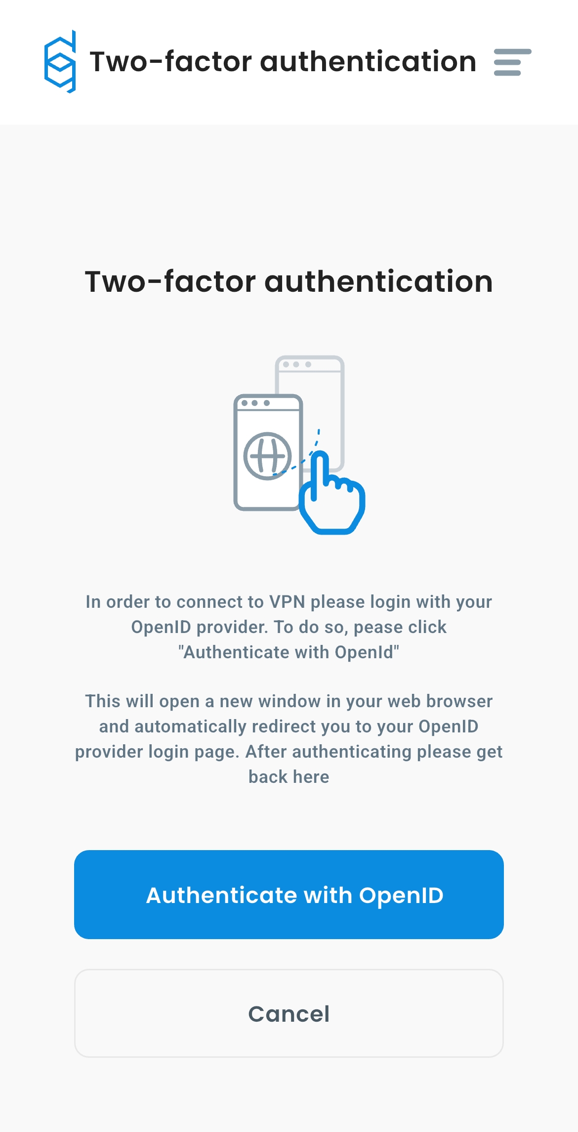 If the VPN location requires OpenID for authentication (external MFA) you will see screen like this: