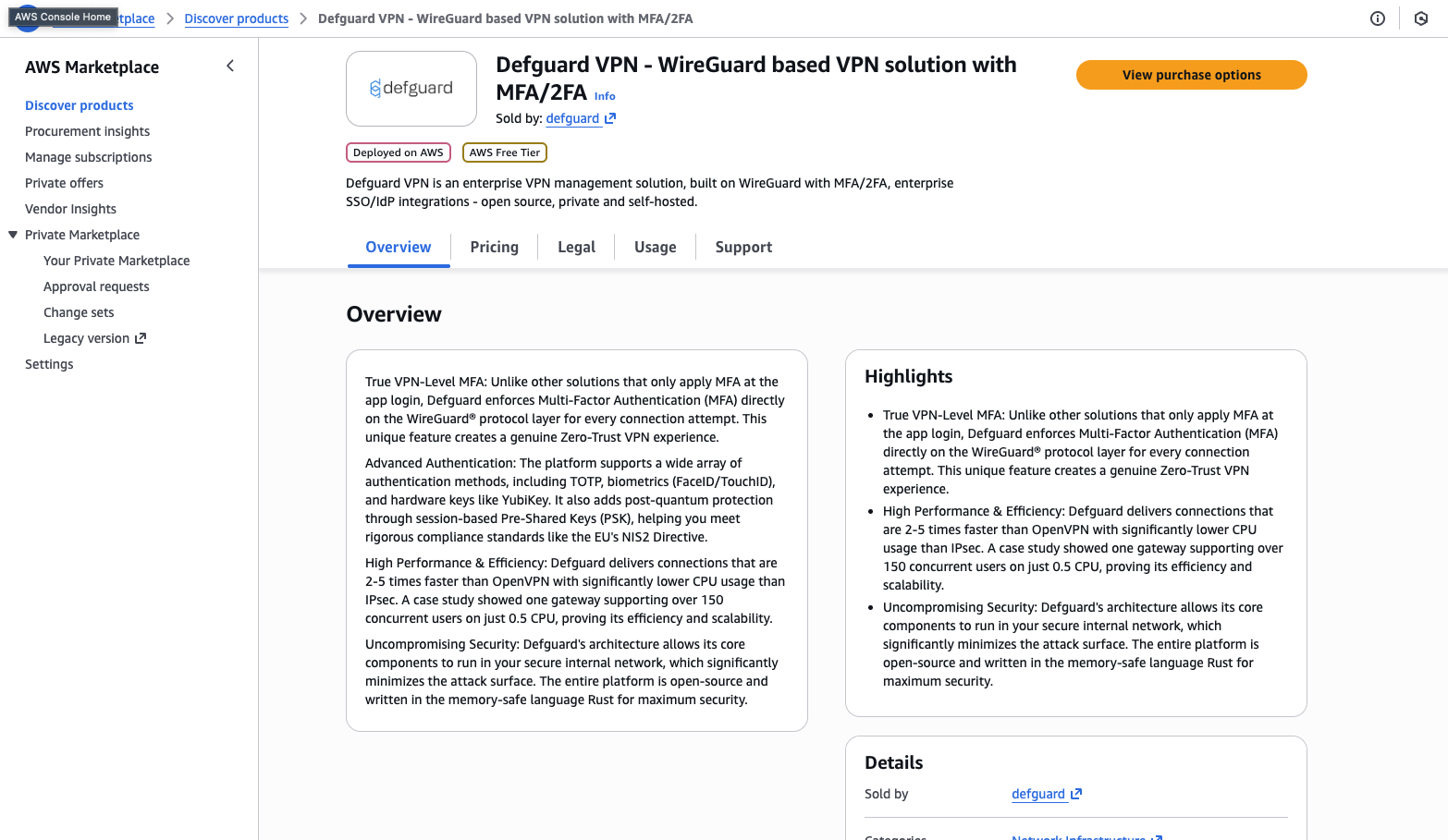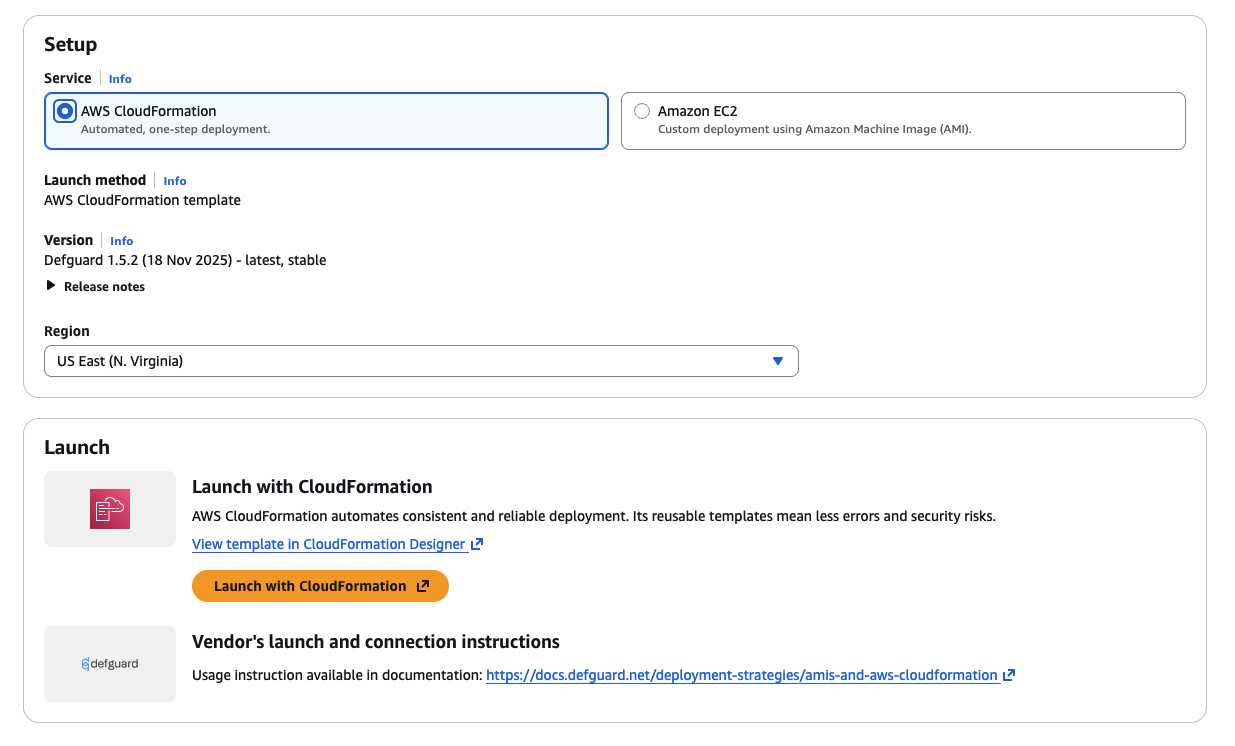 In order to use the CloudFormation template you need to subscribe to the Defguard AMI product. The most straightforward way to obtain the template is to select it during the product delivery after subscribing to the product on the marketplace.