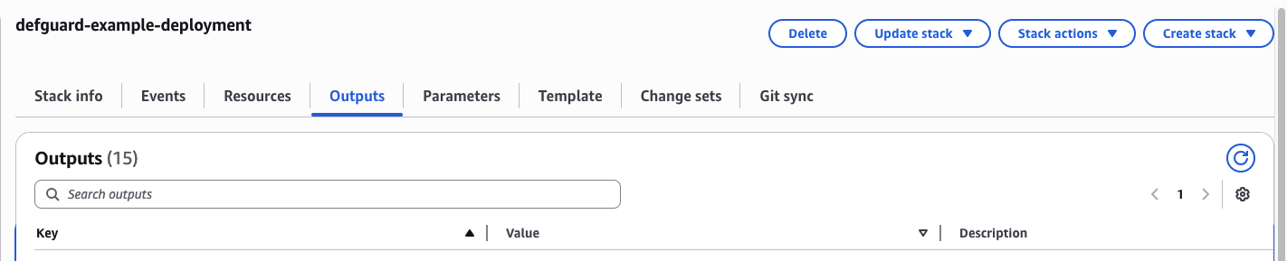 SshKeyName(optional): EC2 Key Pair name for SSH access to instances. If not provided, SSH access will not be available. Requires a manual setup of SSH security group rules afterwards.StackPrefix(optional): The prefix that all the deployed components will receive, for example the Defguard core EC2 instance will be named <StackPrefix>-core-instance.SSLCertificateArn(optional): The ARN of the AWS issued certificate to use for setting up HTTPS for Core and Proxy. This certificate must be valid for the domains specified inCoreUrlandProxyUrl. If left empty, HTTPS won't be configured automatically.