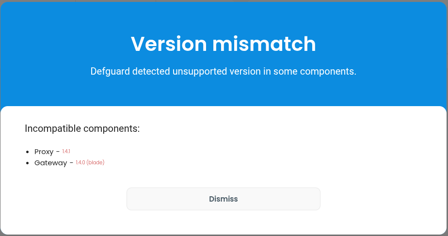 Each service in the Defguard stack can be updated independently, provided the components remain compatible. When components connect, Defguard automatically performs a version check. If an incompatibility is detected, the connection is refused and it will be clearly reported both in the log files and through a dialog in the core UI: