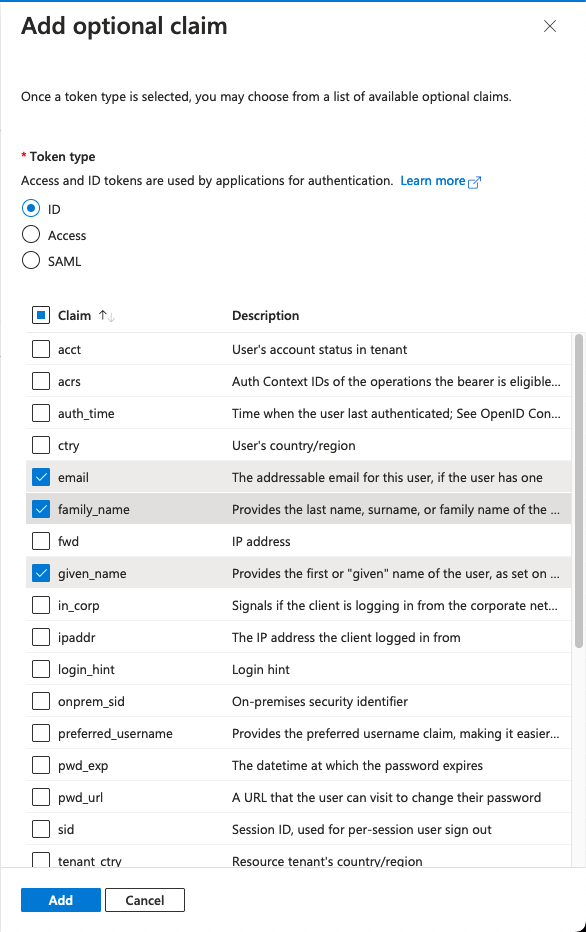 Make sure to select the ID token type and the following claims: