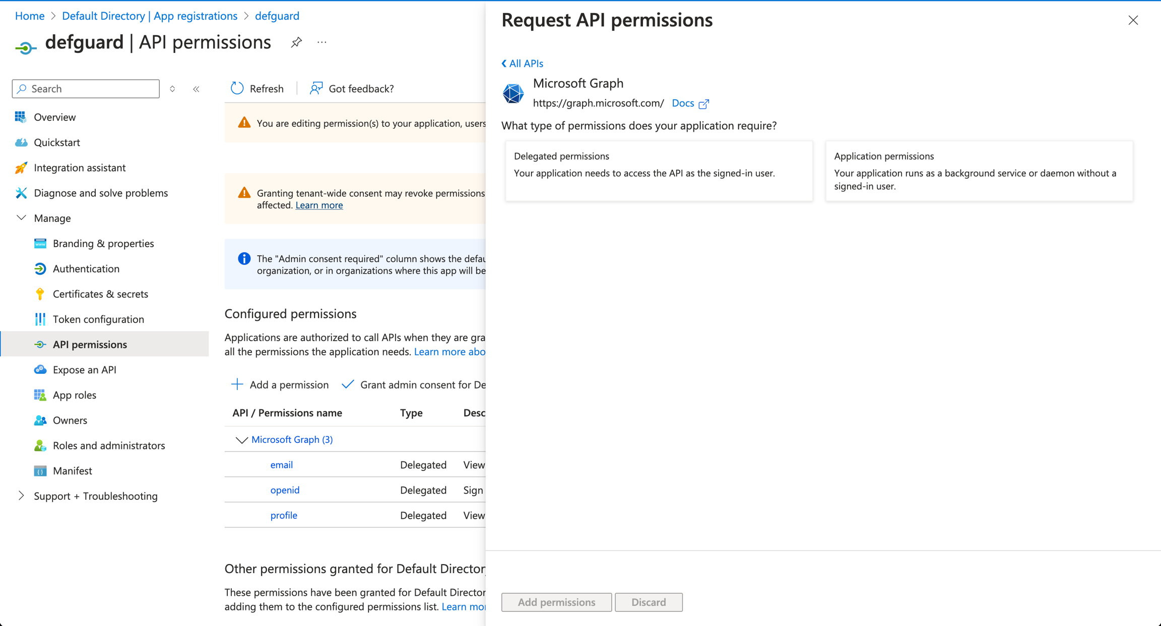 Select "Application permissions", as Defguard will perform the synchronization in the background.\