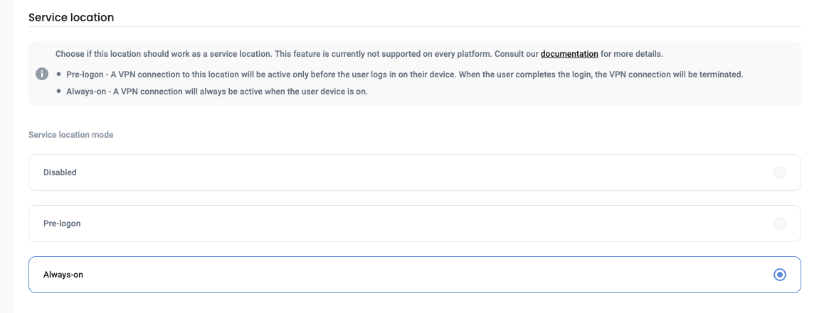 After selecting one of the modes and saving your changes, the location will function as a service location. After the configuration of the Defguard client is updated for your instance, the location will be hidden in the client's UI. The connection to the location will be established in the background without any user input.