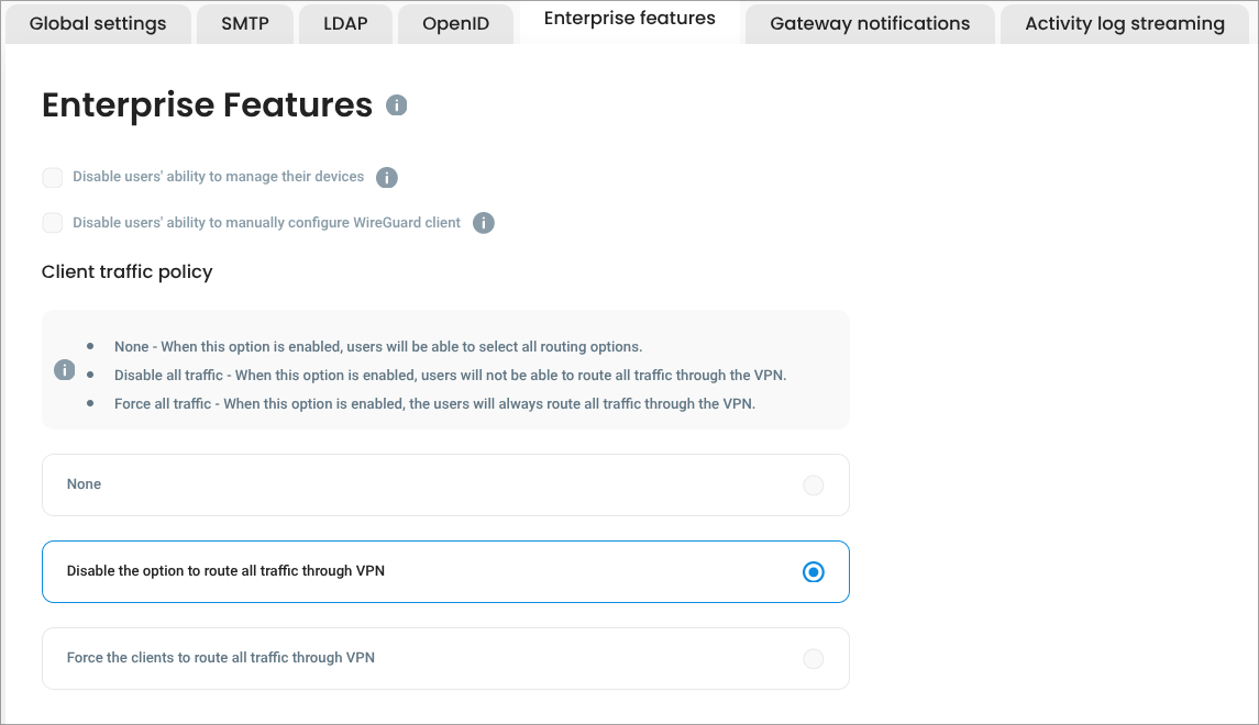 Force all traffic - All traffic is routed through the VPN, the "All traffic" option is enforced and cannot be changed by users.