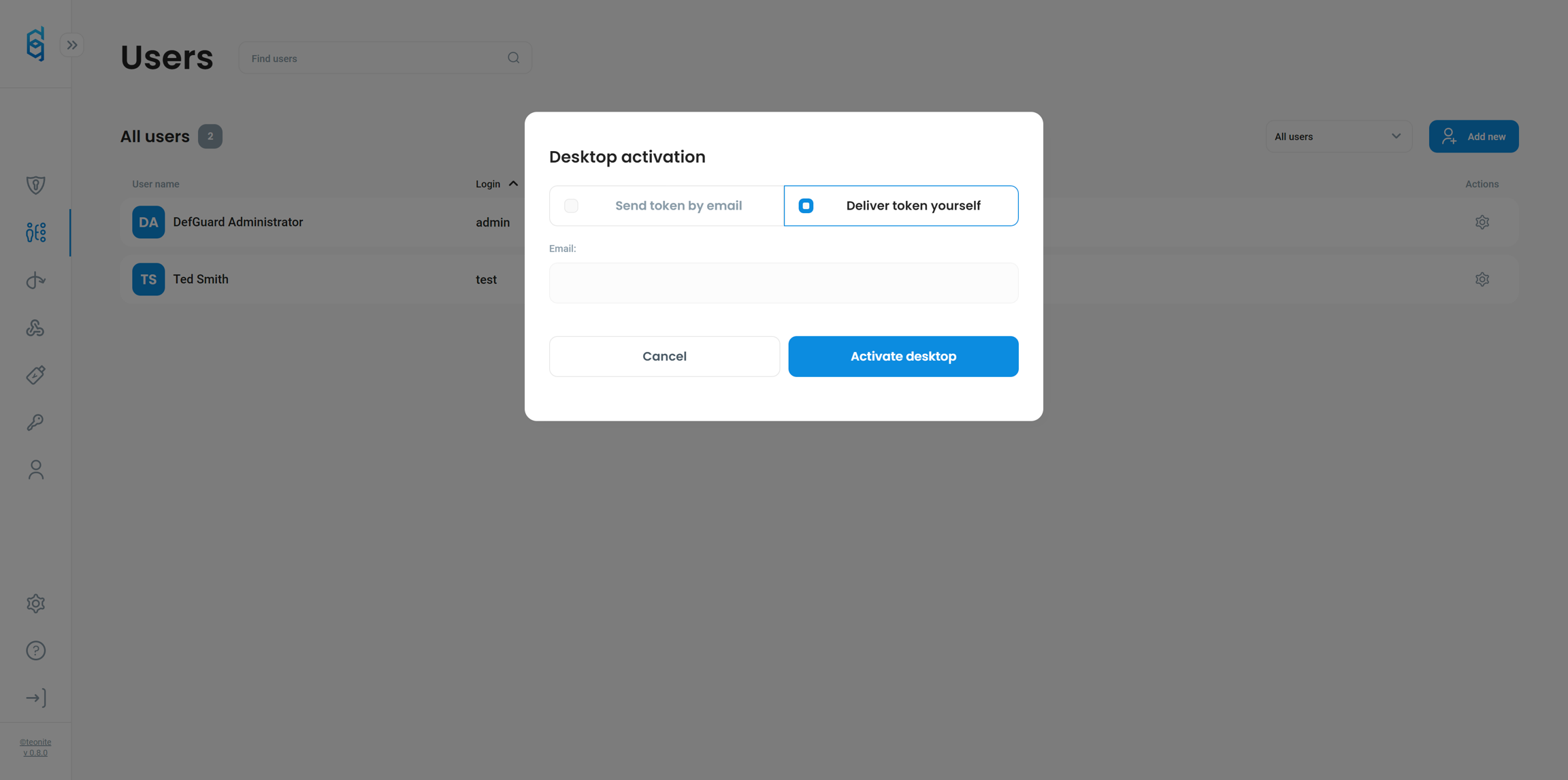 This process enables system administrators to create and distribute desktop activation tokens to users facing access issues to the Defguard instance. It's handy if a user is already enrolled (has an account) but has not configured the desktop client and doesn't have access to Defguard (is outside the internal network and can't access Defguard).