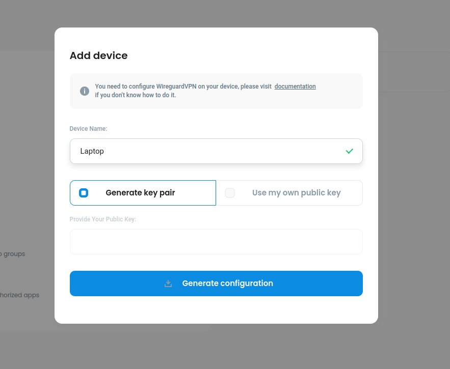 Choosing this option - when you download your configuration (or use QR Code to configure Wireguard on your mobile device) - the private key will be included in your configuration and there will be noting else you need to do