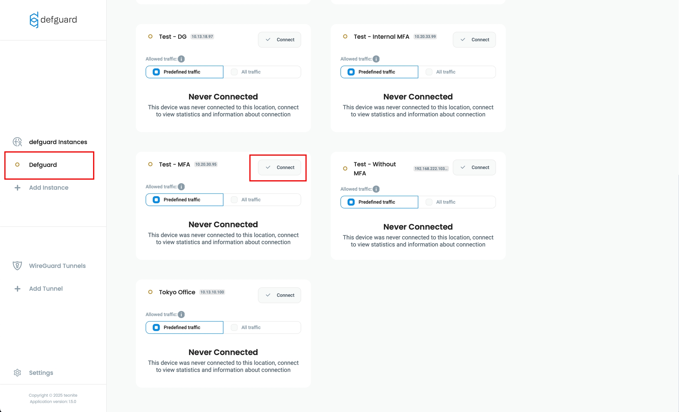 Open Defguard client, select your Instance and click Connect next to location with required MFA