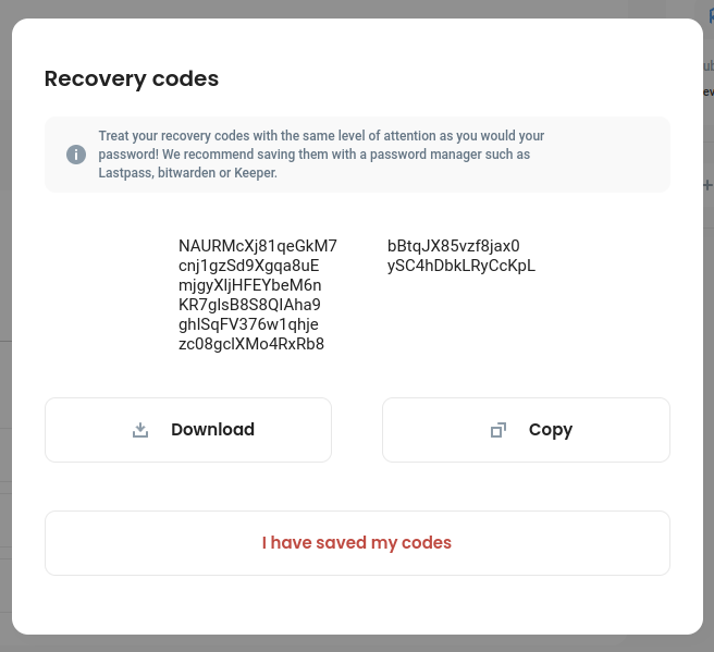 Please backup those codes in a safe place, if you will not be able to login with your 2FA method (eg. you lost your phone or YubiKey hardware key) - the only method to login will be to use one of the recovery codes.