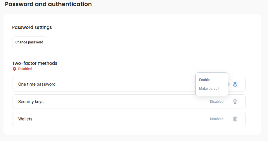 Then scroll down to the section Two-factor methods and choose which one you want to activate.