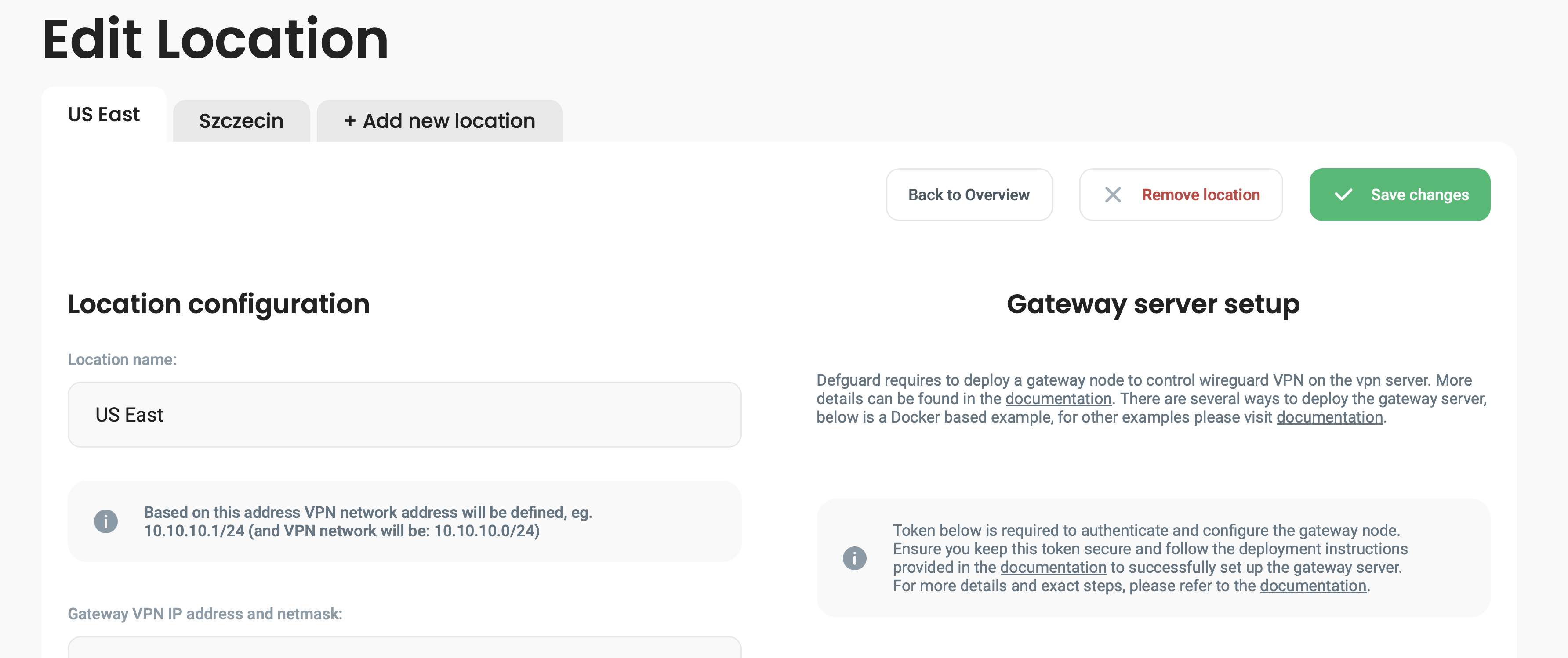 If you already have a gateway deployed and want to add another one for the location, go to *VPN Overview* -> Click: *Edit Location Settings (in the top right corner)*, then choose the location you want to add the new gateway to, and follow the deployment instructions: