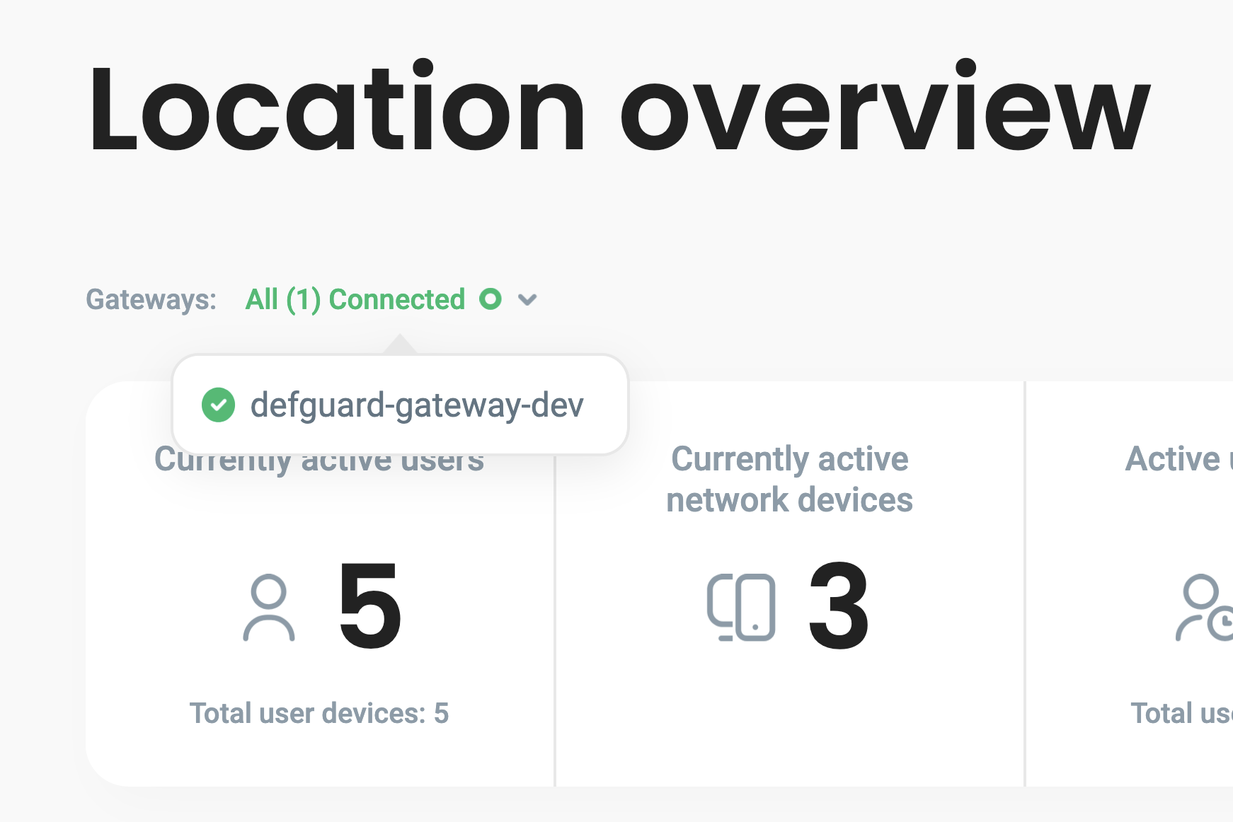 In active-passive deployments using floating IPs (e.g., VRRP), client sessions are not fully recovered when traffic fails over to a secondary gateway and later fails back to the primary one. After failback, clients may still appear as connected in the UI and continue reporting activity, but VPN traffic may stop flowing. In such cases, manual client reconnection is required to restore connectivity. Related issue: <https://github.com/DefGuard/defguard/issues/1909>.