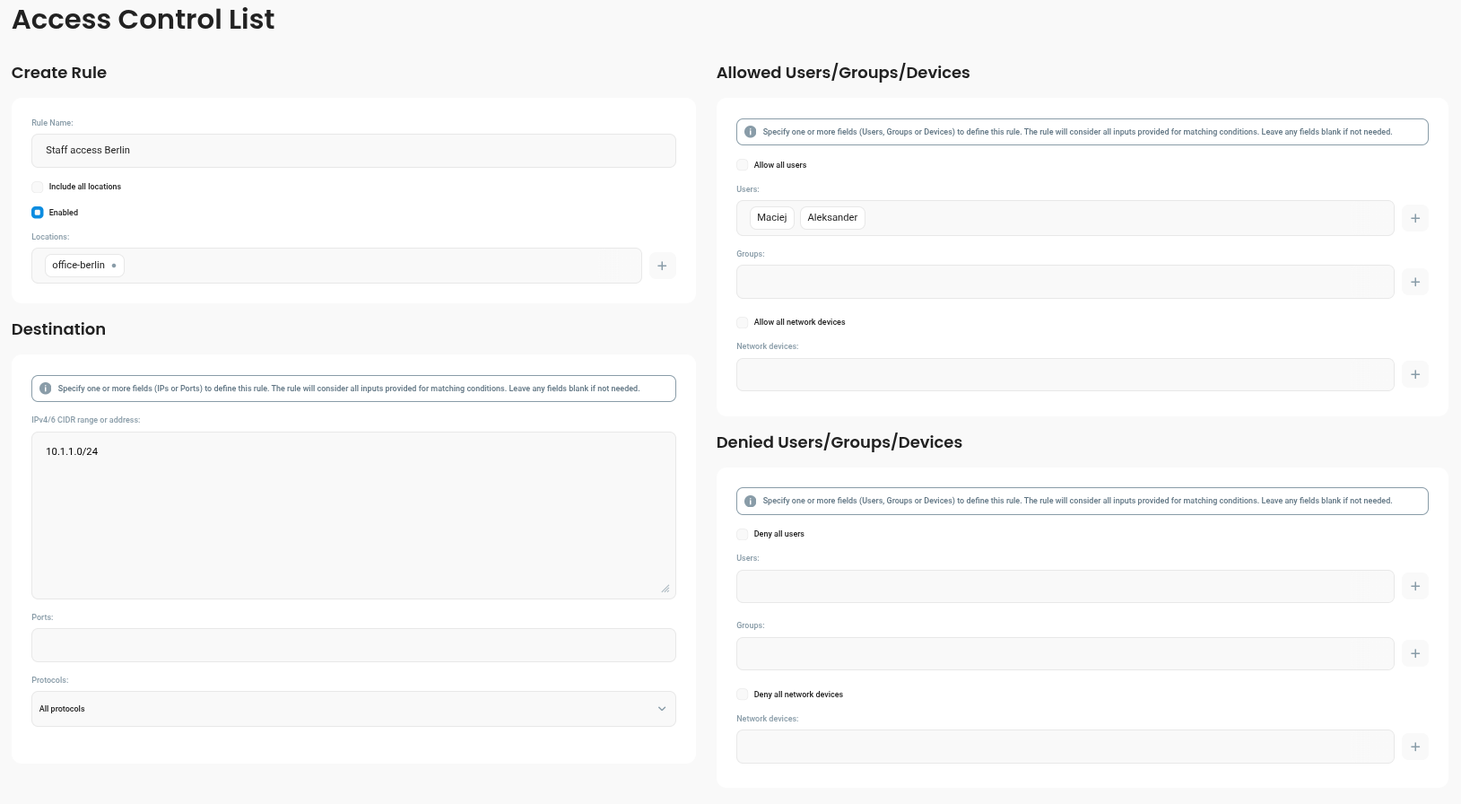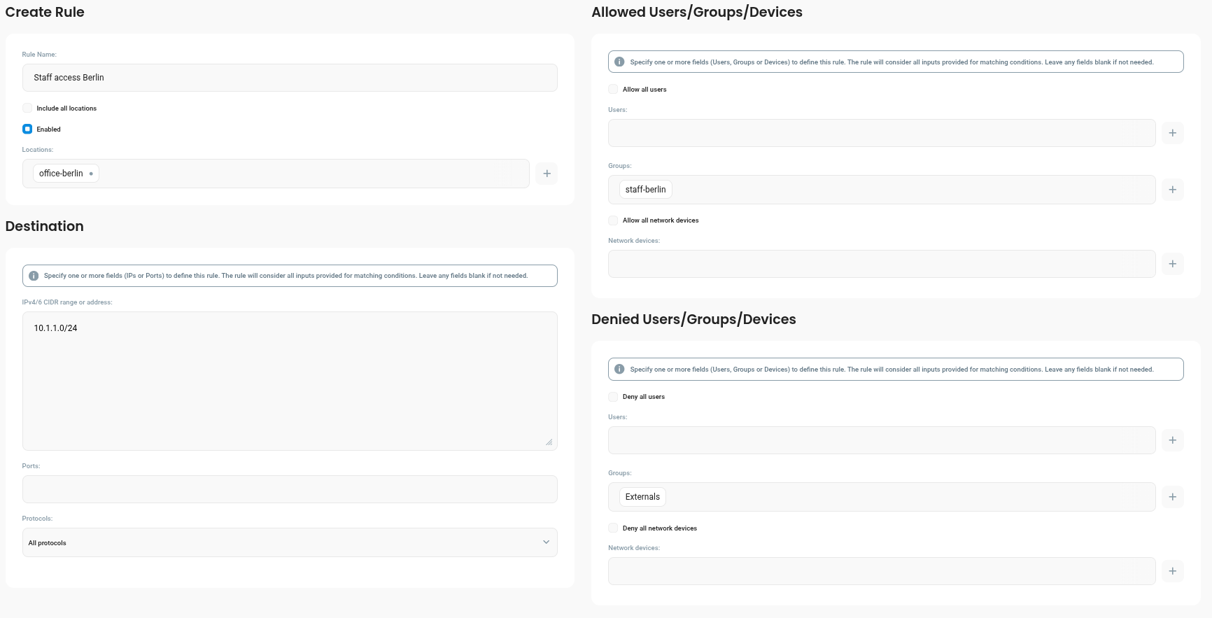 In this scenario, we will allow specific users to access the 10.1.1.0/24 network, assuming the users connect through *Office-Berlin* location.
