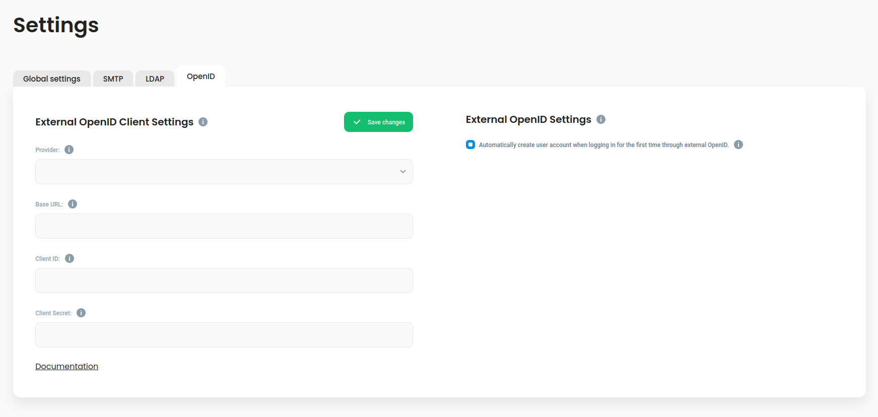 Everything related to the external OpenID configuration can be found in the OpenID tab of the settings page. The first thing to do here would be to pick your provider using the dropdown menu under the "Provider" label. Next, fill out the required information with values acquired from your provider. If you picked "Microsoft" or "Custom", make sure to also make corresponding changes in the "Base URL" field. After you are done, click "Save changes" to keep your changes.