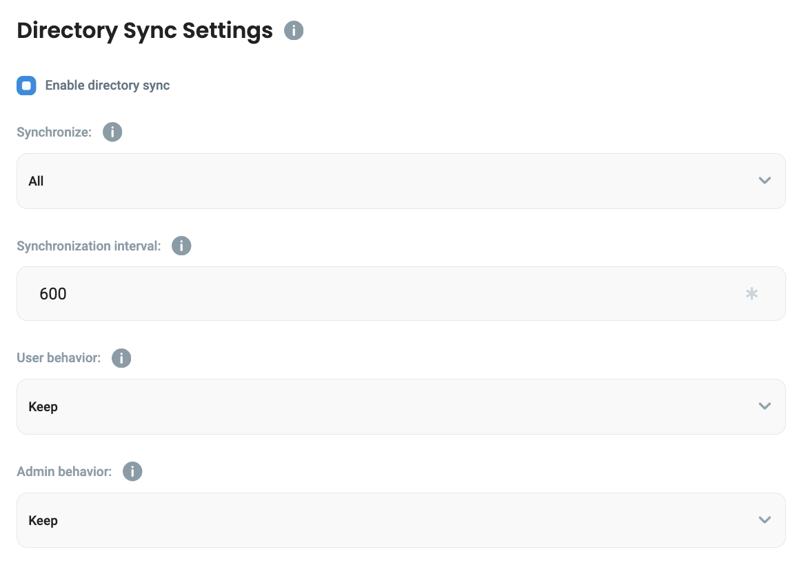 The following configuration options are currently available in the directory synchronization menu for all providers: