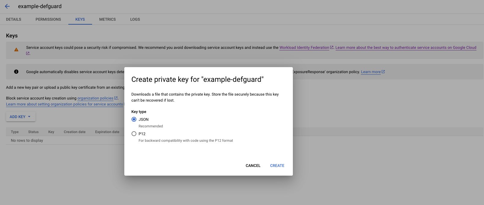 6. A JSON file will be downloaded after you click "CREATE". Store it securely as it may grant access to your Google Workspace directory.
