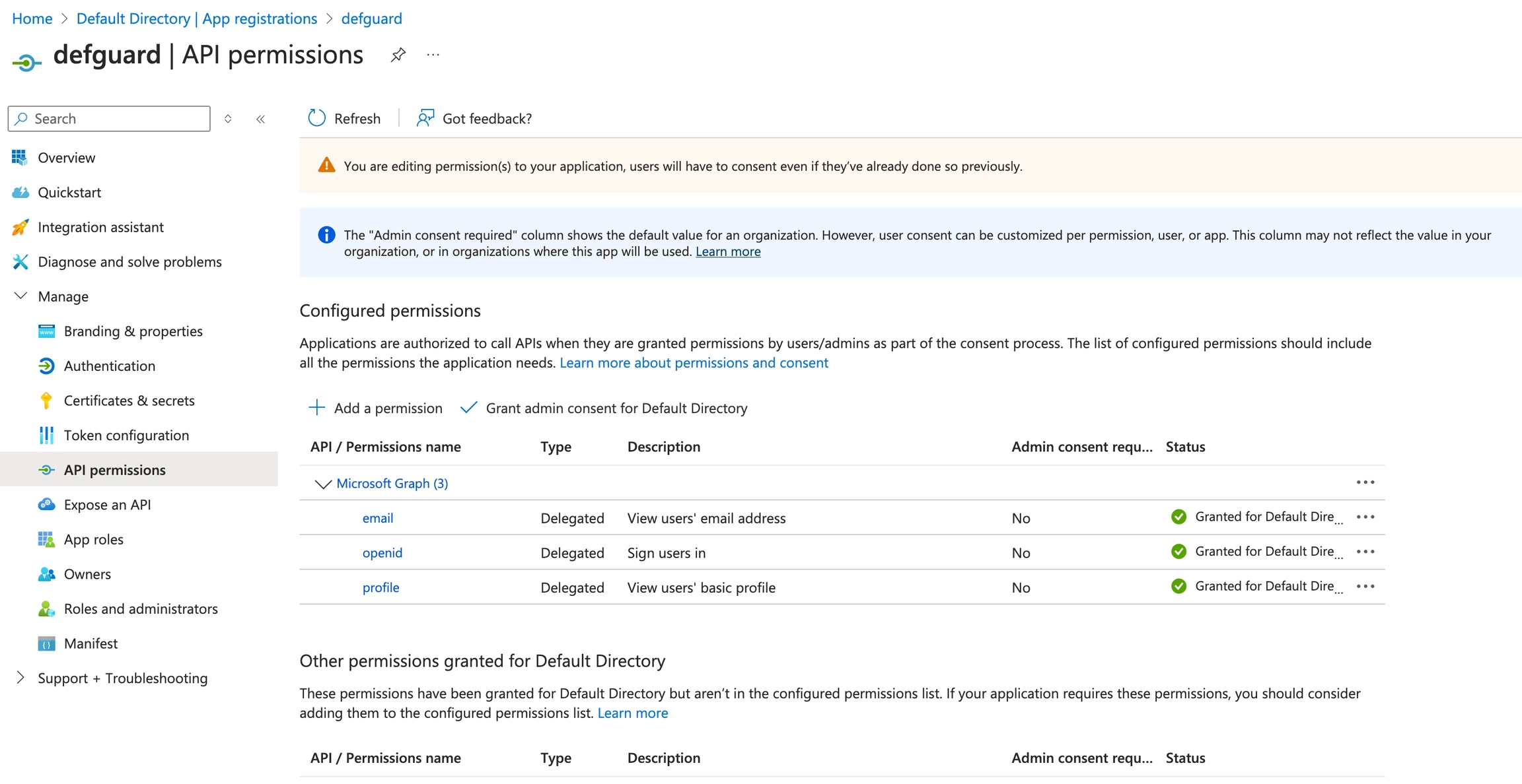 Select "Application permissions", as Defguard will perform the synchronization in the background.