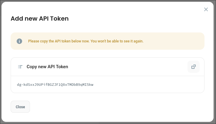 Copy generated token. This is the only time the token will be available in plain text form. If you lose it you will have to generate a new one.