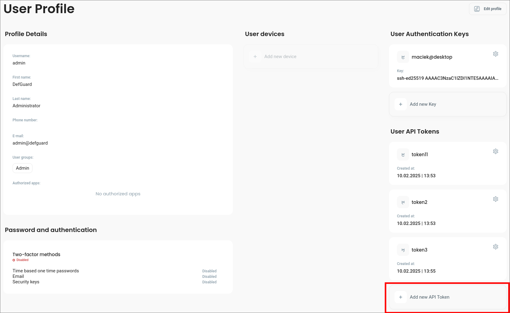 Admin users can generate API tokens to enable request authentication for custom external tools which use Defguard REST API.